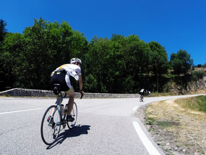 One the flat the team pulled together, and we were able to ride in single file, the speed train! Staying in the speed-shadow means a lot less effort, and by taking turns as the engine, we were able to power our way ahead, overtaking a substantial amount of other cyclists. As we neared the largest col the going got harder and I started to slow. Knowing I still had about half left I couldn’t risk forcing my knee. Constantly worried about dropping out so far from the start, T dragged me all the way to the top and the prize: 20 or so kilometres of pure descent!