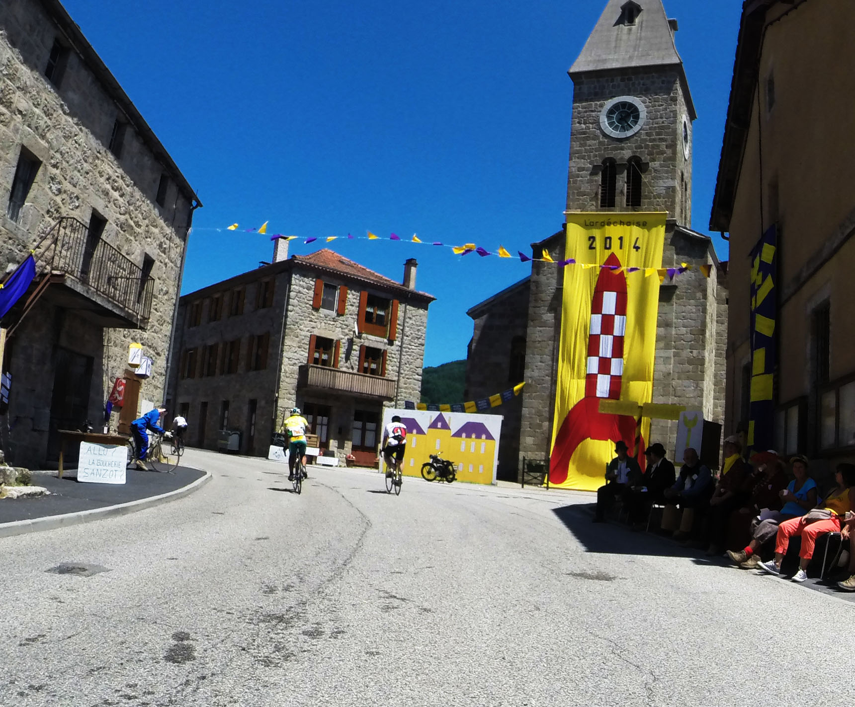 The next day we explored the Ardeche, visiting several of the villages, including Balazuc and Pont d’ Arc. It really feels like holiday country, with camping’s and gîtes everywhere. You can understand why though; it has the “French feel” to it, meaning all the villages are postcard perfect, there are flowers everywhere and there seems to be a total absence of economy. It was great to relax and see some new places, and the weather was good enough to spend some time in the water. At Pont d’Arc, as the name suggests there is an enormous natural arch which crosses the river, making for spectacular scenery. That being said, I think we all preferred the river al Balazuc, which was much less crowded. As the Ardechoise cuts through many of the villages, they were decorated with yellow and purple flags, as well as bicycle sculptures.