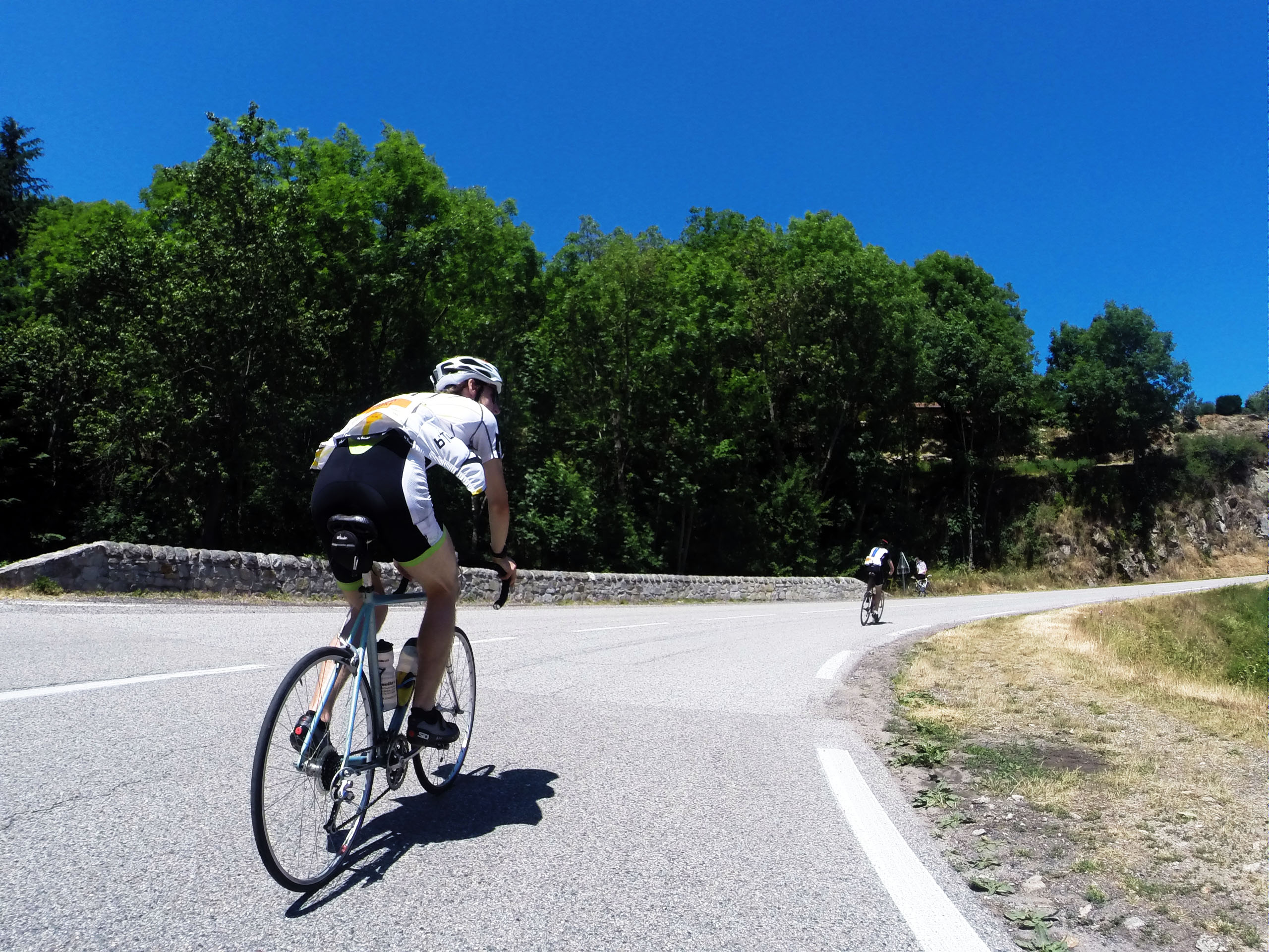 As the day went on and got hotter and hotter, we also started to run out of energy. But thanks to the resupplying posts we could keep going. The final col was short but by far the steepest. Halfway up my knee started to really hurt. But by this point, knowing it was the last climb I didn’t care. Gritting my teeth for the last couple of hundred, I slowly rolled up to the top. On the side several cyclist were just lying in the grass, the heat too much for them. As a I cleared the top all the rest were waiting for me. It was a great feeling of comradeship with which we set off, down the last descent and back towards St Felicien. We had done it!