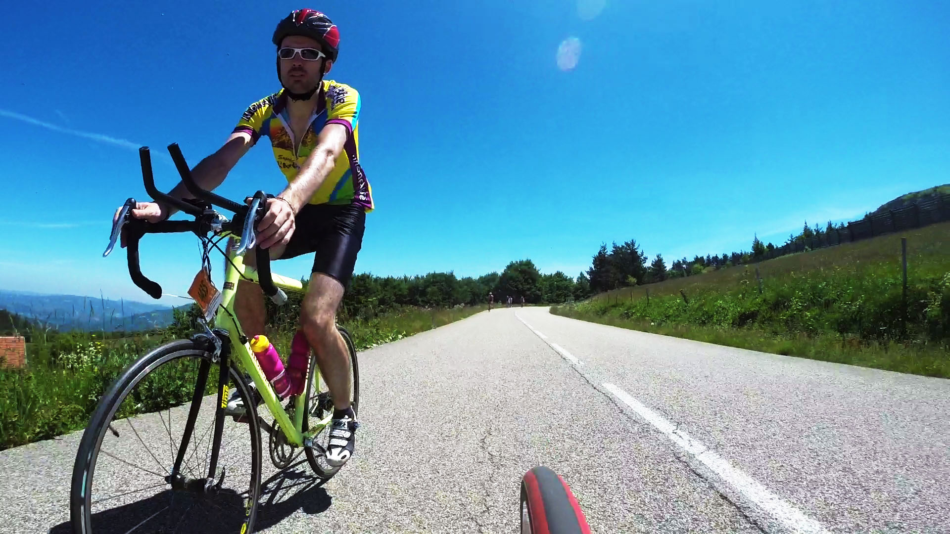 One the flat the team pulled together, and we were able to ride in single file, the speed train! Staying in the speed-shadow means a lot less effort, and by taking turns as the engine, we were able to power our way ahead, overtaking a substantial amount of other cyclists. As we neared the largest col the going got harder and I started to slow. Knowing I still had about half left I couldn’t risk forcing my knee. Constantly worried about dropping out so far from the start, T dragged me all the way to the top and the prize: 20 or so kilometres of pure descent!