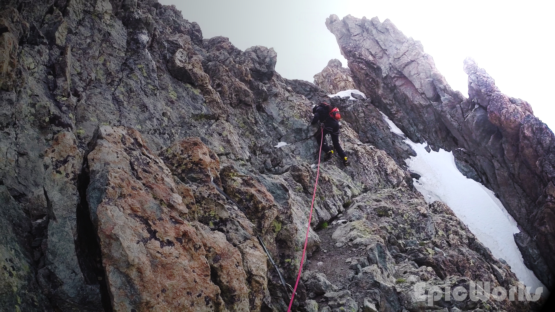 A windy night didn’t bode well, and our spirits weren’t too high in the morning. The objective was the west peak of Le Rateau via the west ridge. We set off following yesterday’s footsteps, the wind was still sharp. The first part of the climb is a small snow slope that goes up to the Col de la Girose. As always with this type of thing, it’s right at the beginning I feel the most scared. “Why am I doing this? It’s going to be awfull! Just look at that; if I slip there I’ll freefall for a few minutes!” All this goes through my head as I start to rope up. I hope once I get going it will get better. I didn’t use to be so worried; I can’t blame it on the accident. Maybe I’ve just lost it… But I had to forget all of this as we started up, climbing over the bergschrund or rimaye (the crevasse that separates glacier from mountain). The snow slope, as always, was easier that it looked from below and we got into the rhythm of things. Up to the Col de la Girose and then to the base of the rock ridge. Here we put our ice axes away and with J in the lead, started the climb. It slowly got steeper as we went up, but never really difficult. Advancing as a unit, the leader puts the protections in, while the rear-guard pulls them out. This way if anyone slips, the whole group always has the rope through something tied into the mountain. It is also much faster that belaying and can be used in easy terrain. Soon we were half-way up, and although the wind was still very cold the first cable-cars hadn’t arrived yet.After the last metres of an icy couloir we had a choice: either climb a steep wall in front of us or go around to the right.