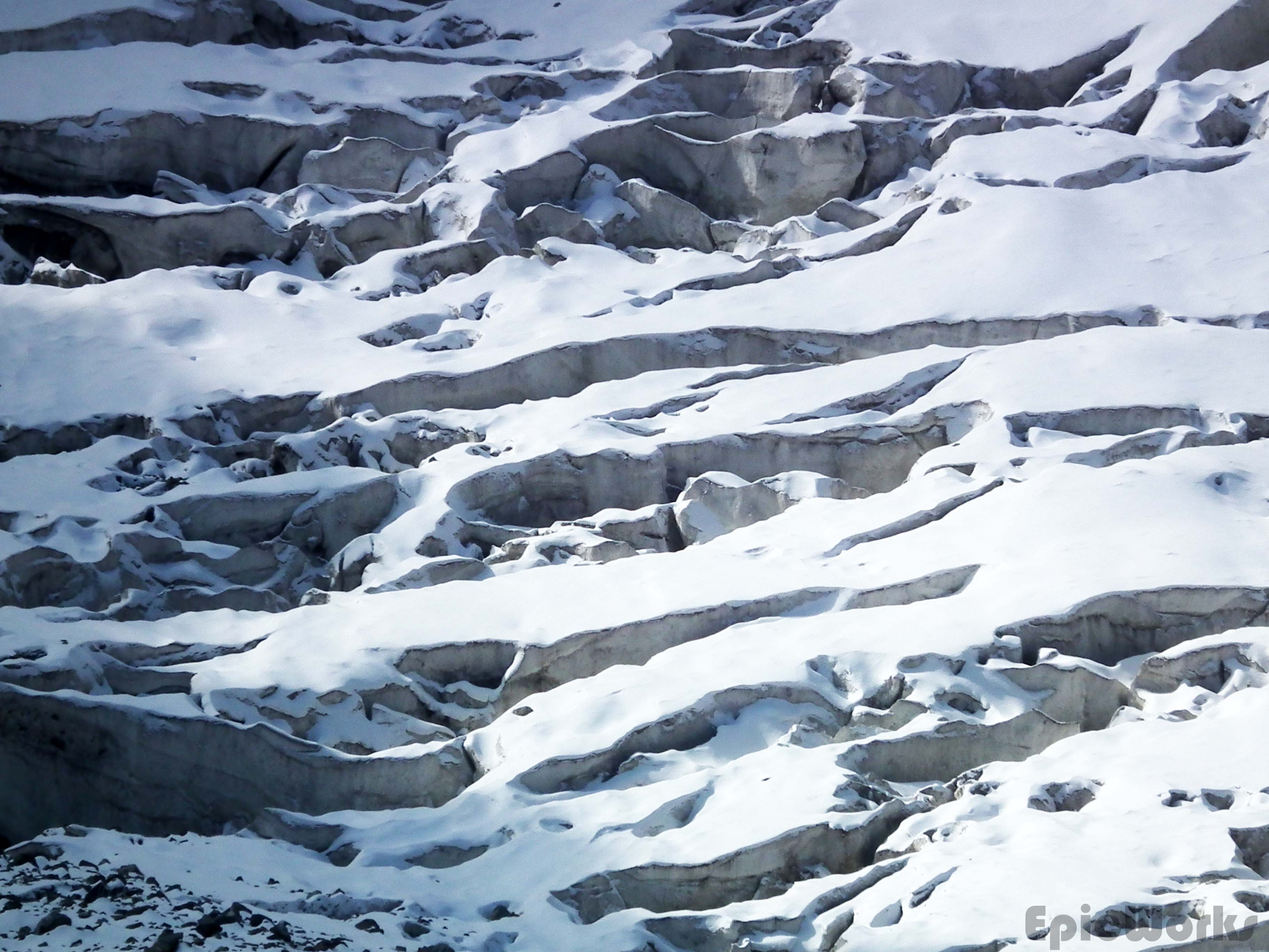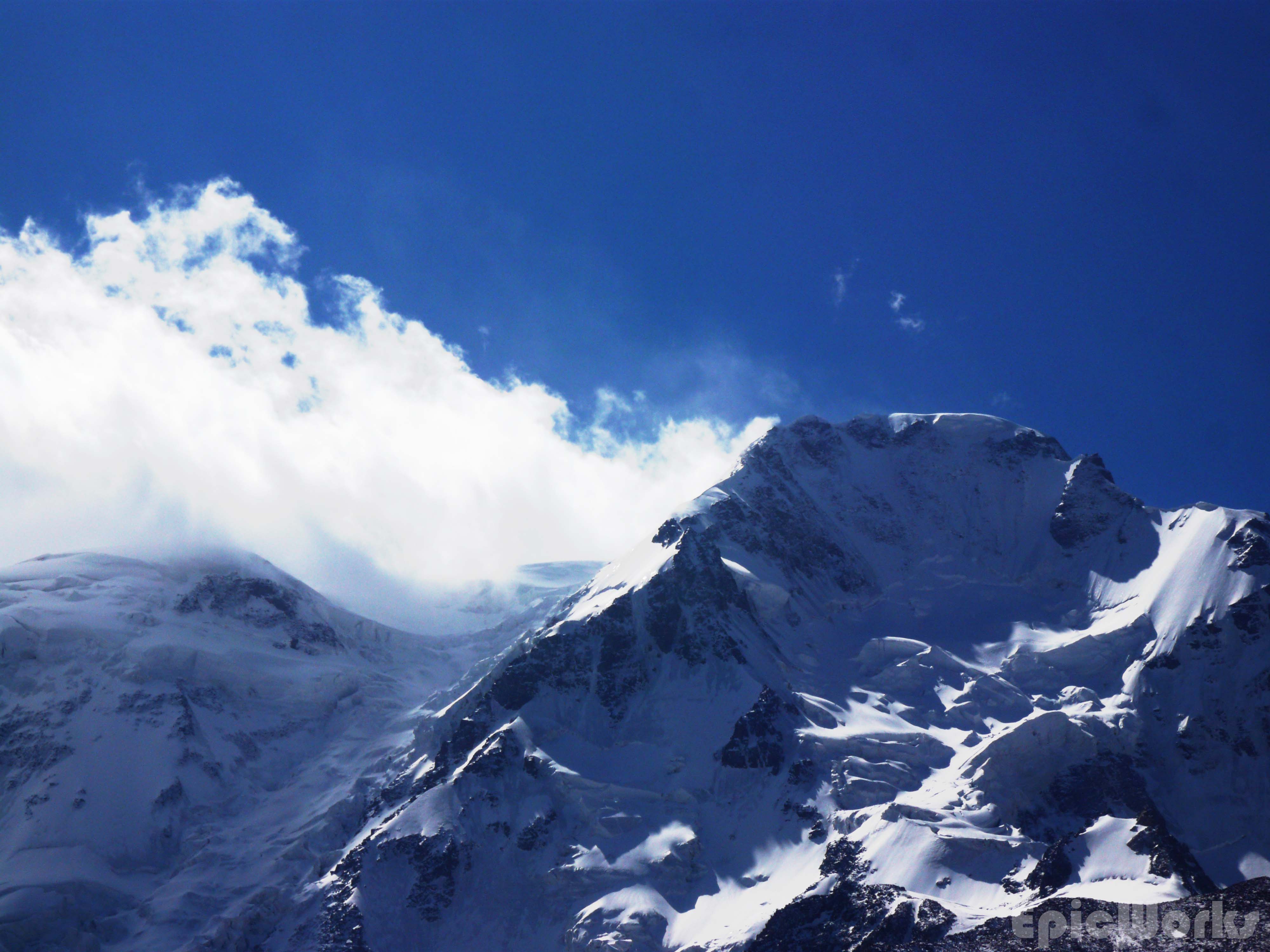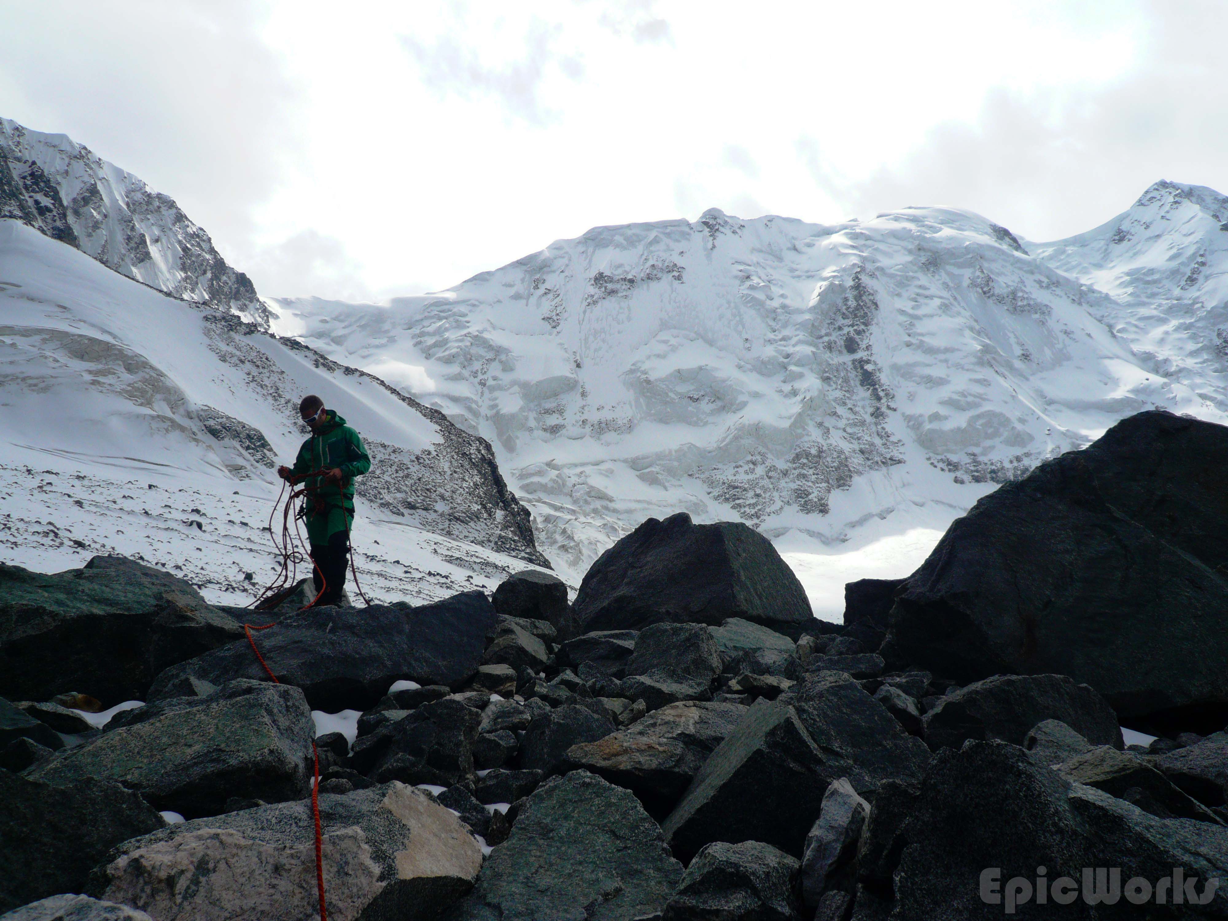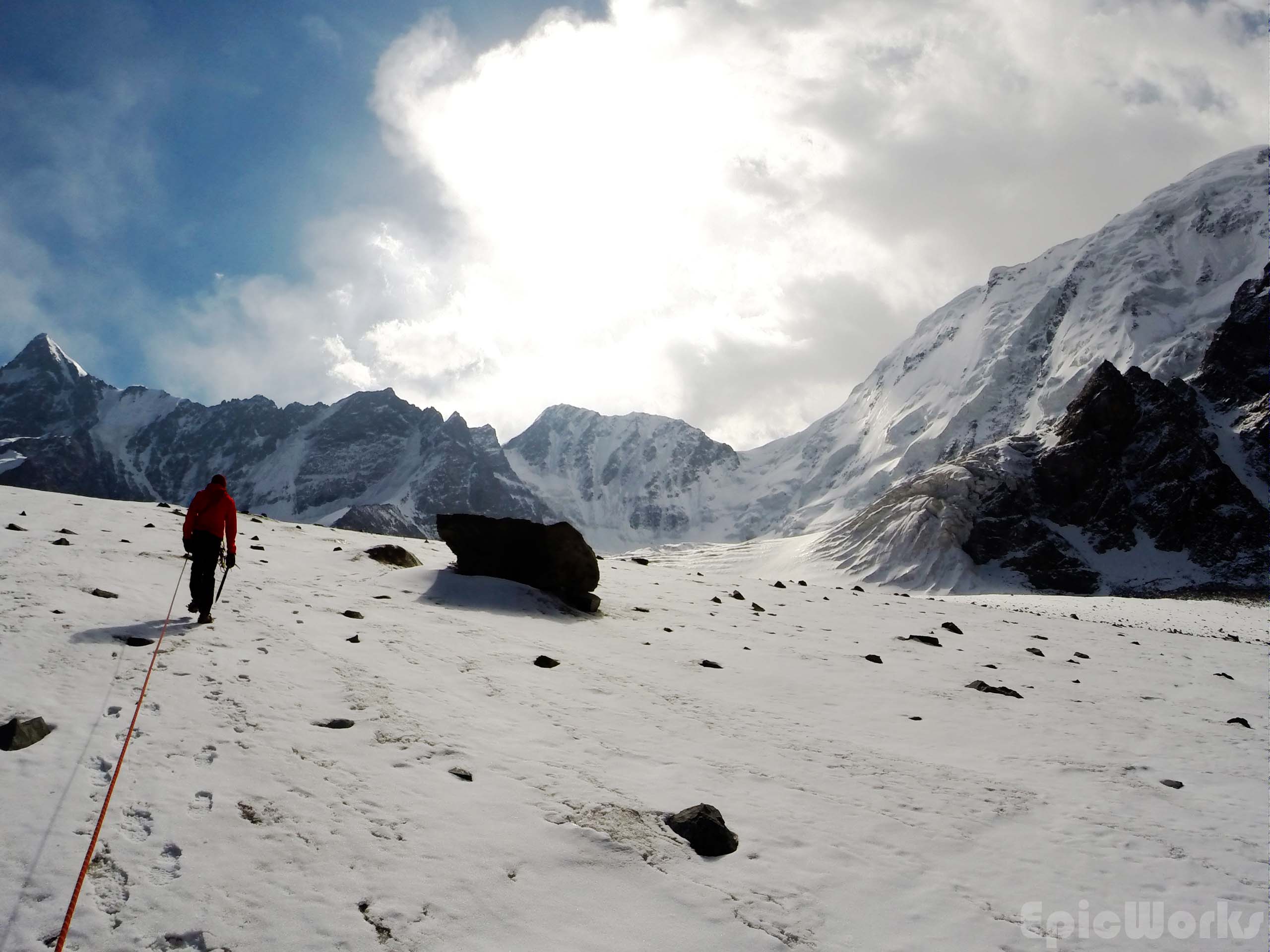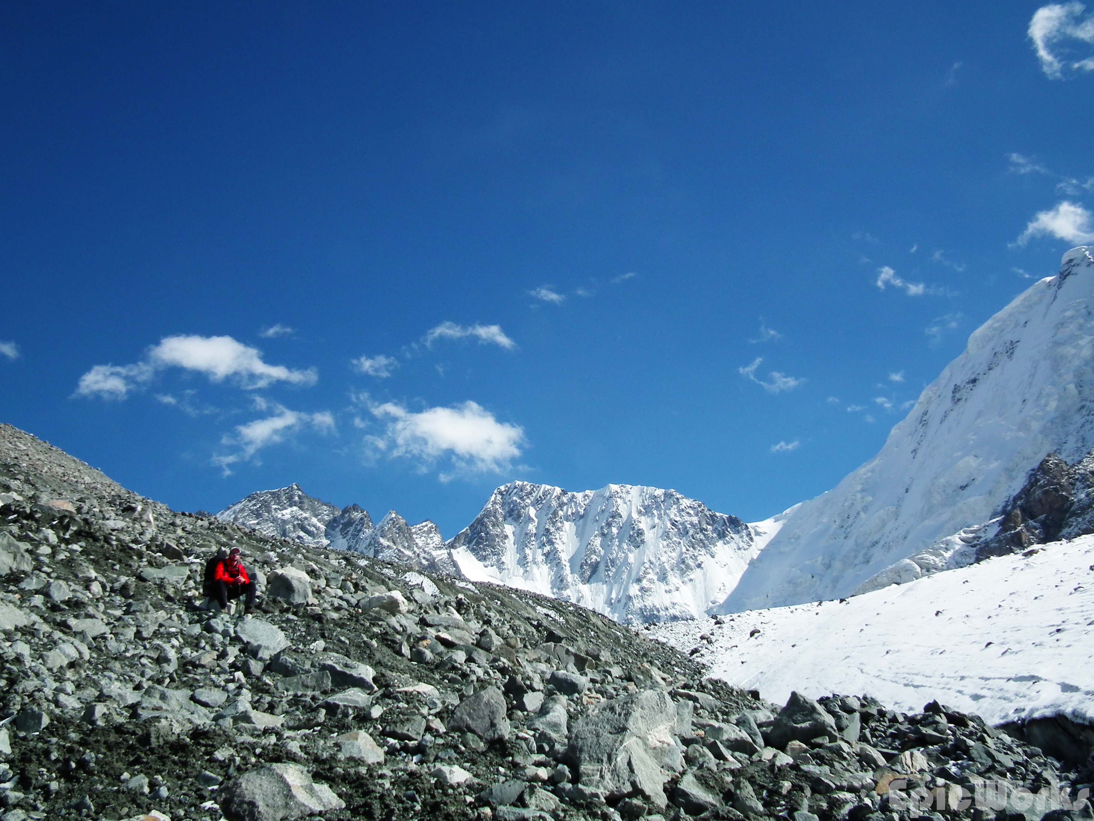 Day 3 and we were supposed to be going as high as possible. Although by this point we had discounted the 4700 m peak we had originally thought about doing due to realistic timetables and no outside communication, we wanted to get the col that separated us from the next valley and hopefully get an idea of the peak. Thomas wasn’t feeling at all good, but still managed to set a good pace up the glacier, following yesterday’s descent. As we got to the place we had started down from we crossed a Russian couple going down. We were quite surprised to see anyone, as we had been told the valley wasn’t visited that much and it was the first people we had seen in two days. The said they had come up the same way. Having said goodbye we continued up, in between the ice and crushed stones. The view of the 5000 peak was astounding, the size of serracs and crushed ice massive. At this altitude (just below 4000) the previous days snow hadn’t melted, and we left powdery footsteps as we went up. After several hours we had passed the north col and almost arrived at our destination. As we approached we could see a fine band of rock separating our valley from the next. Although not too high they cut off the view and passage to the other side. Maybe climbable, it did suppose an important obstacle, so we decided to go no further. After some photographs of the valley and surrounding peaks, we headed down the way we had come, re-crossing the ice-bridge one final time. Thomas was dead by this point, so the we spent the rest of the day resting.