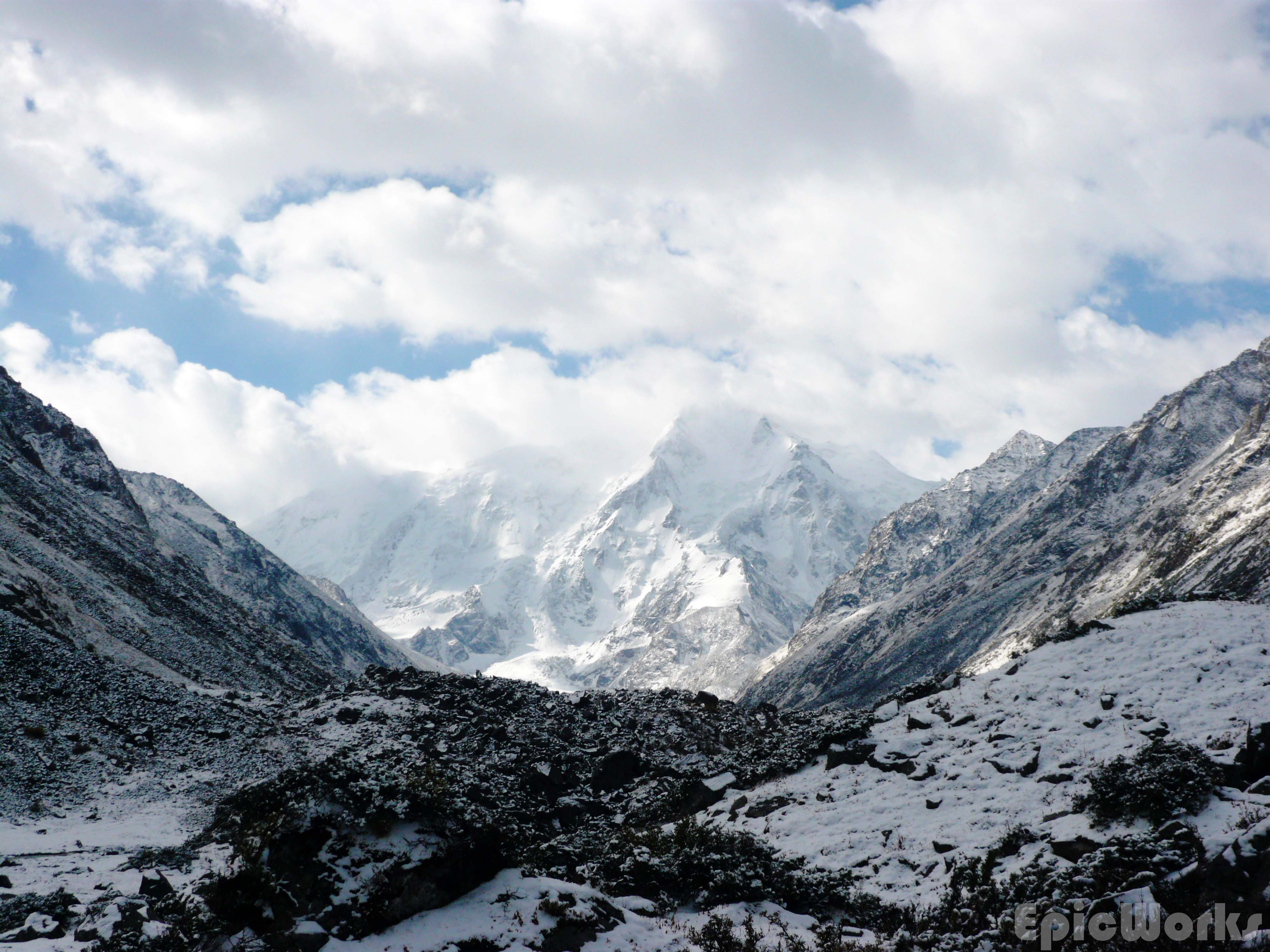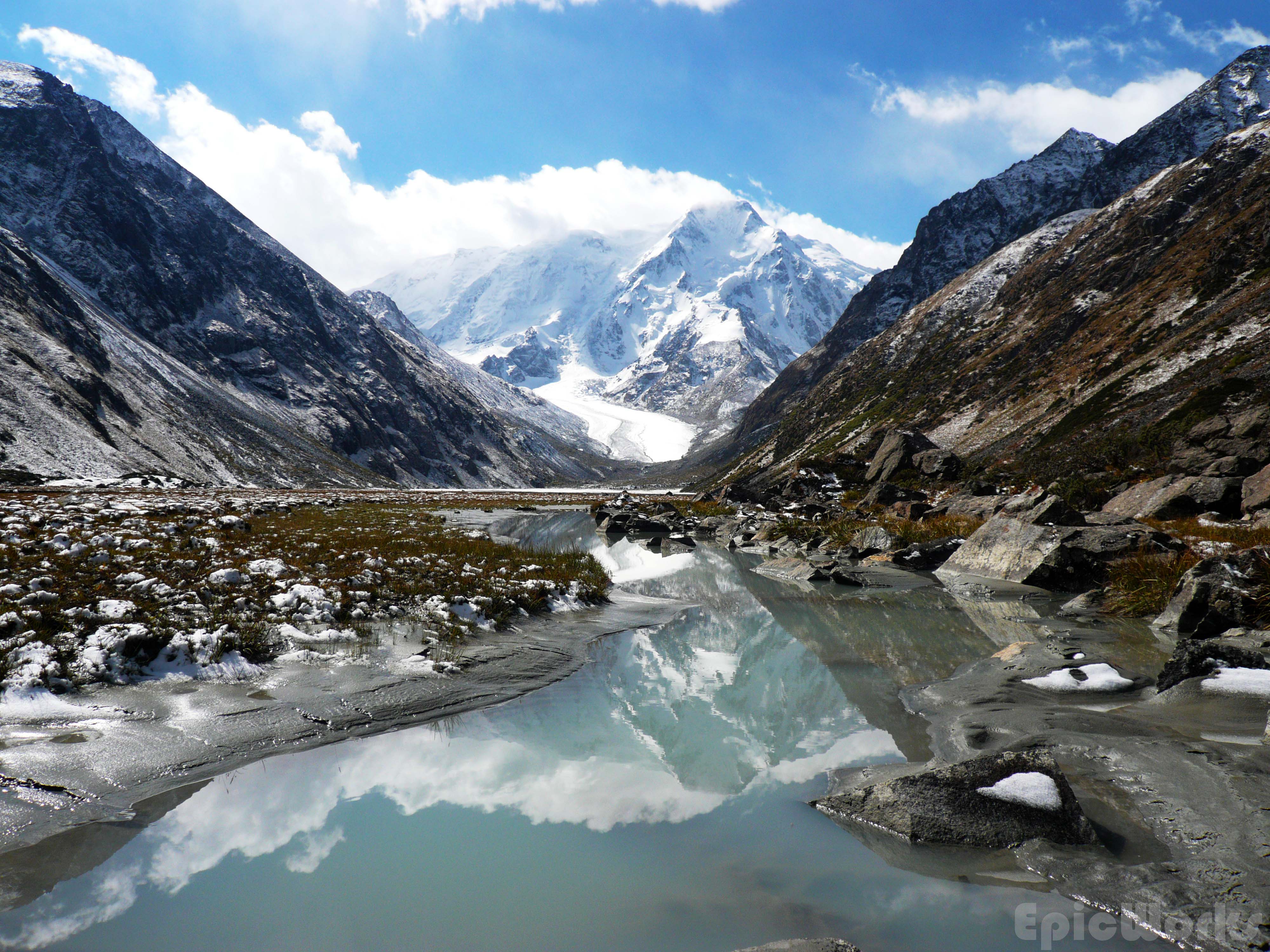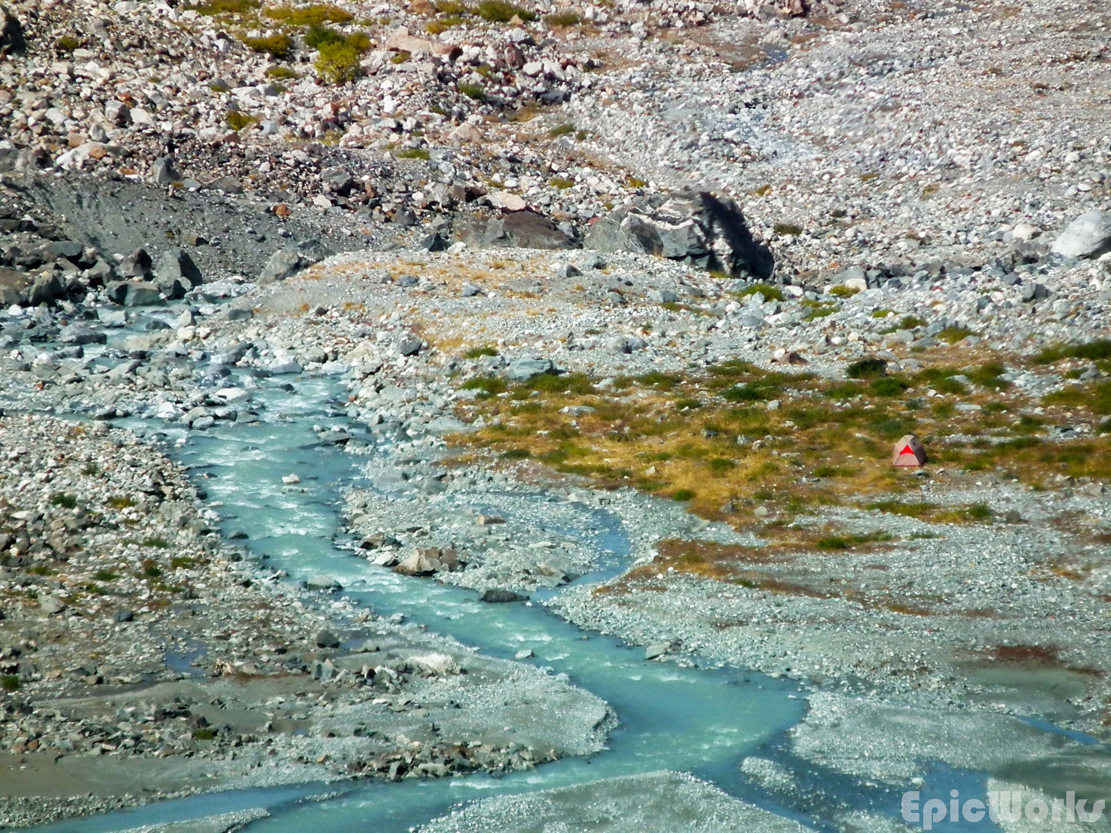 Snow. As I opened the flap next day a chunk fell off the top of our tent. Not much, about 5-10 cm, just enough to cover everything and produce a beautiful effect. We soon ate, packed and set off up the valley. It widens and the path slowly disappears. A large flat flood-plane is criss-crossed with small rivers which we jumped across to keep progressing upwards. The massive peak looked down on us as we got to the end of the plain and started on the crushed rock found at the end of the glacier. We set up our tent and decided to investigate the glacier during the afternoon.