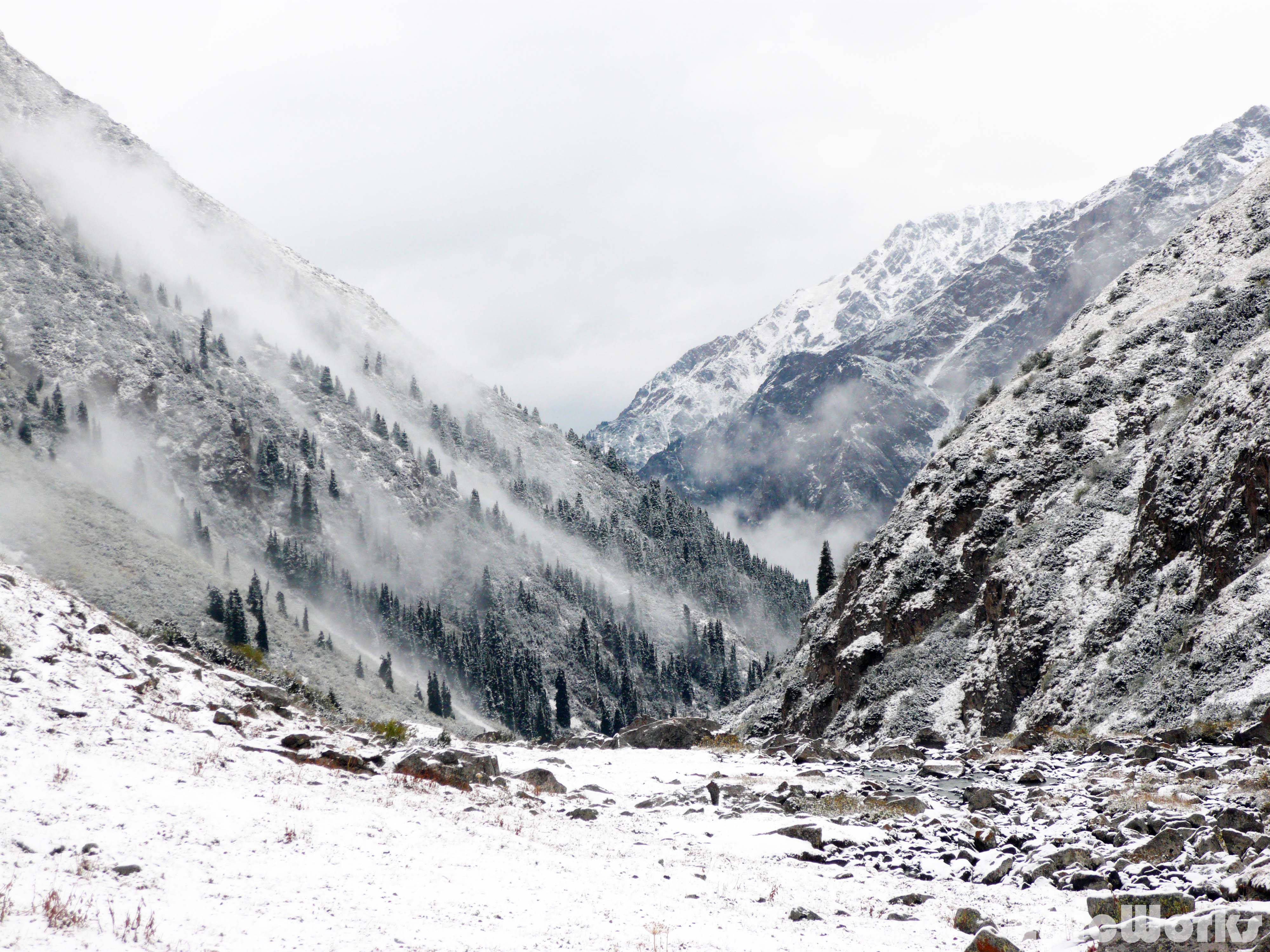 So what were we able to find out? The permit for being 50 km away or nearer to the Chinese border is now more complicated to obtain and takes 5 working days. We weren’t quoted a price but I don’t thinks it’s too expensive. This did mean that in our case we automatically discounted the possibility of going to the high mountains as we didn’t want to spend so long in that part of the country. For the equipment rental we were referred to Extreme Tour Shop. This is a small house a 5 minutes’ walk from the centre. After having waited for more than 3 hours for the owner to arrive at 8 pm we were able to rent rope, harnesses, ice-axes, crampons, carabineers and ice-screws. The shop is well stocked, especially with alpine skis and also offers some mountain clothes and kit for sale. The equipment we got was old but functional and pretty cheap by western standards. Although some of the companies did have their own kit and could rent some of it, there wasn’t much, and we counted ourselves lucky to find the crampons. I would probably recommend that if you are thinking of doing some serious stuff, bring your own. Finally for the transport, as we didn’t want to spend too much money at this point we decided to go the easy way into national reserve closest to Karakol. To get there you can take the 101 marshrutka and then hike up the trail. This is the way to the touristic Ala-Kol lake, but we were hoping to go past it and continue up the valley to see some of the 5000s and try and explore a bit. The marshrutka costs 10 som and entrance into the park 250 som person + 150 tent.