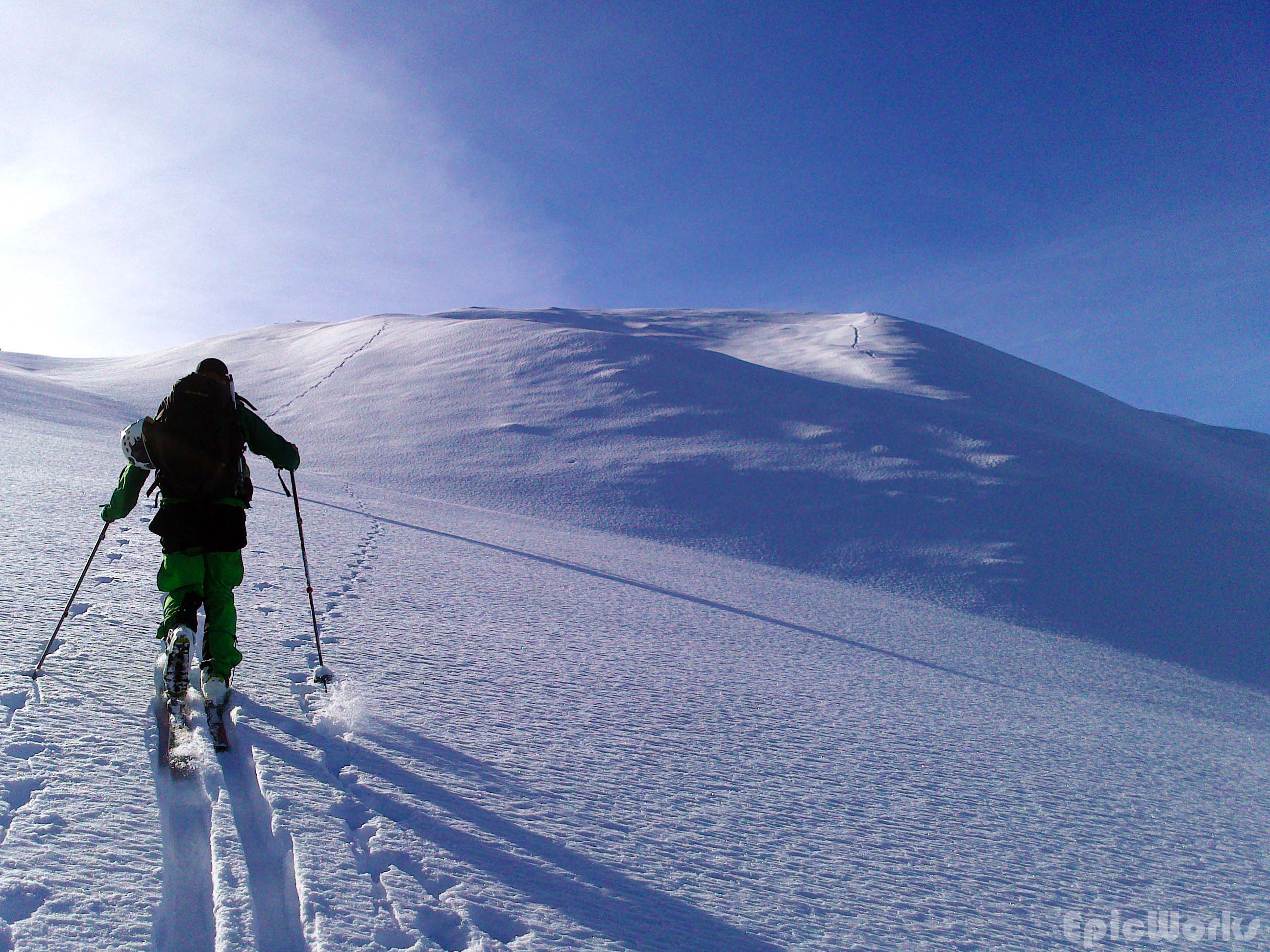 Next morning we were out in the snow by 6, only to find the temperature had just kept rising since the previous day. With the mercury definitely above zero the powder had turned into thick slush. We headed out and it was soon apparent it was going to be a long march. As I checked my sole I found I already had several kilos of snow stuck to the skins. Going forward with this much weight was just impossible. Luckily we had a small candle, and by rubbing it vigorously along the skins managed to keep them almost snow free. This process had to be repeated every several hours to replace the wax as it wore off. Getting out of the valley via a slightly steeper slope we got to the choosing point: continue towards the Dôme, adding both distance and height, or cut across the Col du Soufre and start heading back. Decisions, decisions..! Although taking into account the terrible snow, the worsening weather and distance to get back, there was really only one sensible option.
