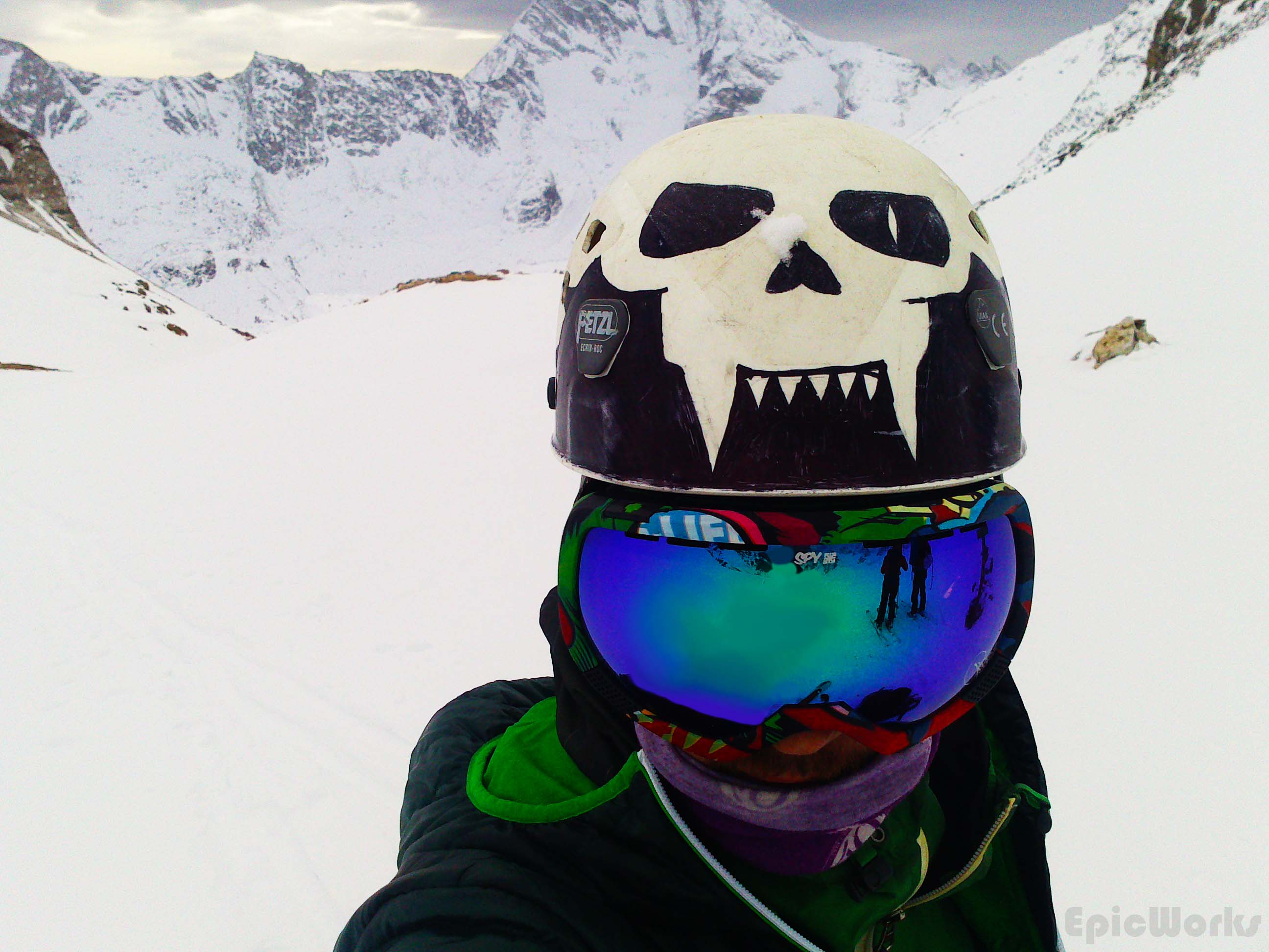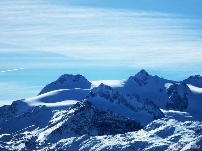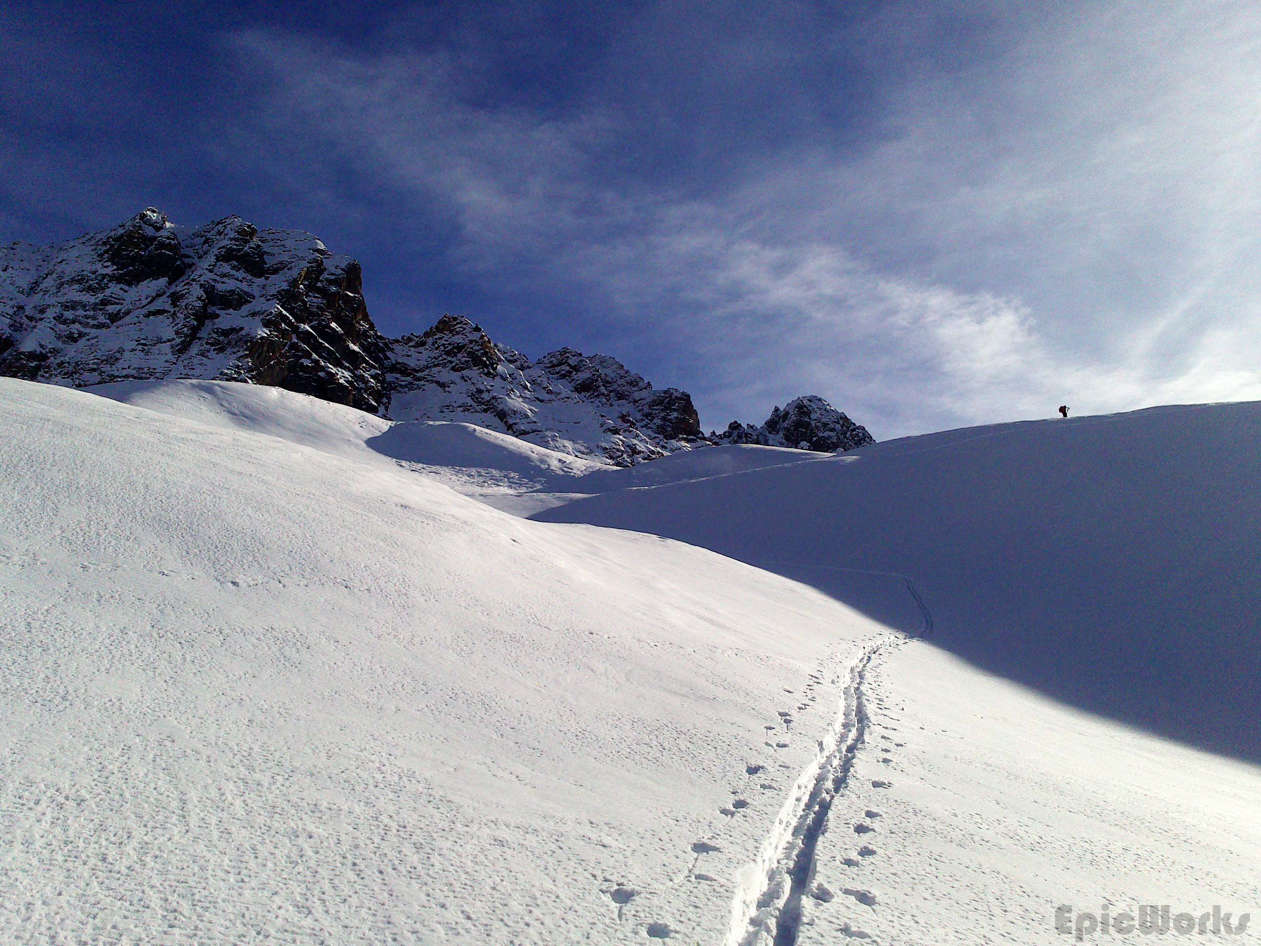 So once again J., JB. and myself where up earlier than most sane people on a weekend. After parking, we were on the first lift up, taking us up past the skiers on the lower slopes, scraping their kit on the stones poking out of the groomed slopes. The view opened up before us, with the long, rounded shape of the Dômes de Vanoise on our left. Dead south was our objective, the Dôme de Polset rising out of the mountains in front. After a false start we started the traverse. Having made use of the lifts, meant we were actually further from the start than the normal route, a distance we had to make up as soon as possible. After a couple of hours we were able to leave slopes and the artificial constructions behind. Although very sunny there was irregular amounts powder, which we had to push through to make the tracks. Other animals had also been on there way, leaving multiple patterns in the soft snow.