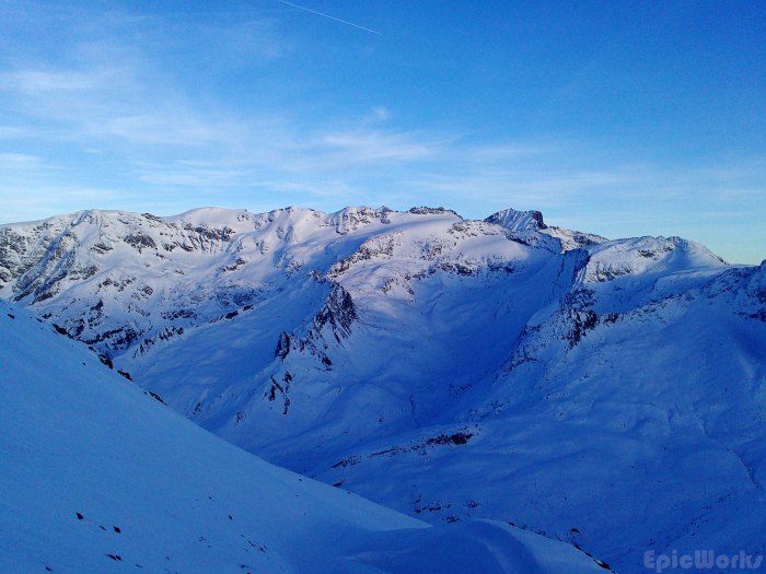Skiing down the Glacier de Gebroulaz we managed to make some headway before picking our way through an ever thinner snow cover. Finishing off by a riverbed, we criss-crossed, (and in some cases fell in the small stream) before getting back out into the open. Strapping into our bindings, all that was left was the ascent back up to Chanrouge, the traverse of the flat valley before making our way across the ski station. Easier said that done. With both light and snow fading away into nothing as we got the bottom the last grass covered slopes, we navigated out way through million euro chalets before getting to the car.