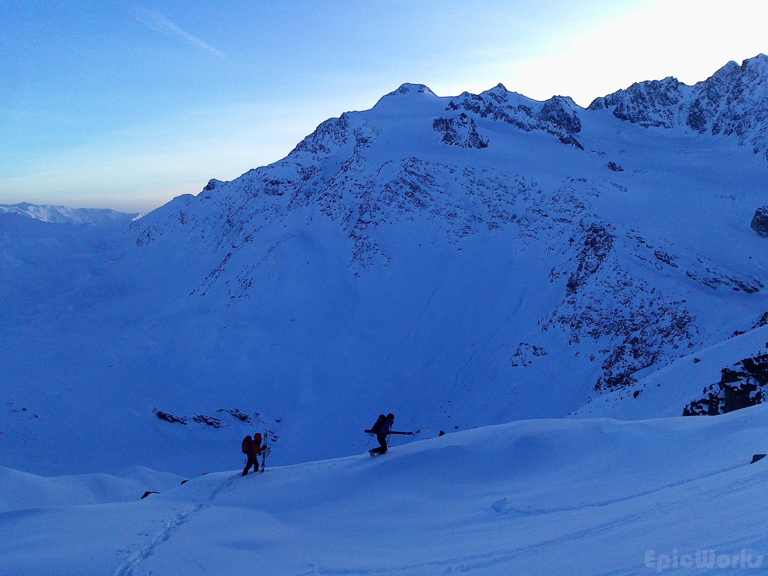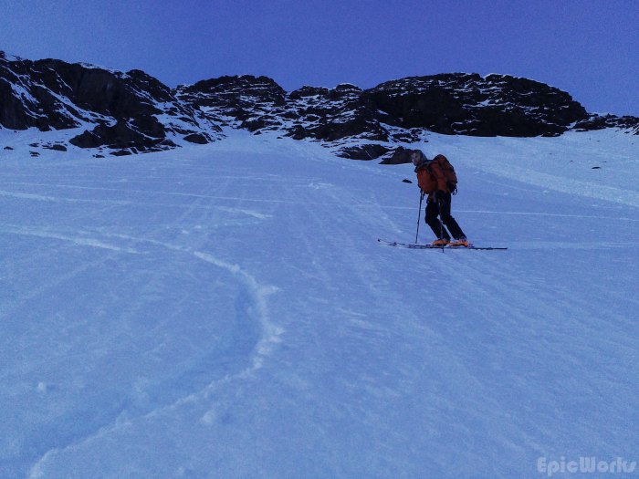 Arriving at the Col des Fonds, the last important obstacle between us and the refuge we looked down on the Lac Blanc. Up until this point all the north faces had been in quite good conditions, with untransformed light snow. It was quite another story for the south faces, which had bene in the sun for several days. This had translated into a hard crust on a layer of soft powder. Impossible to ski correctly on light, flimsy rando kit. Sweating from the effort we got down just as darkness fell, the sun setting behind the Dôme, high above now on our right. Bordering the lake in the dark, my bindings started to play up. When I finally got them working again it was pitch black. Meanwhile the others had been searching for the refuge. A quick map check and we headed out slightly south-east, our headlamps poking into the gloom. Suddenly the square shape of the refuge made itself apparent. Pleased with the progress made during the long day we soon got inside and made supper, bottle of red wine included. Discussing next day’s objective, we were of divided opinion about the possibility of getting to the summit and back to the car before nightfall…