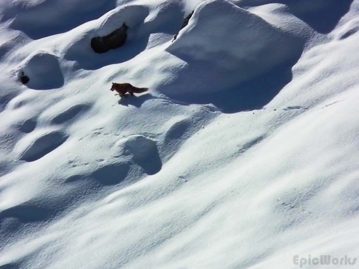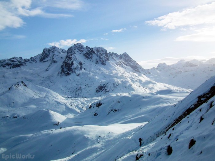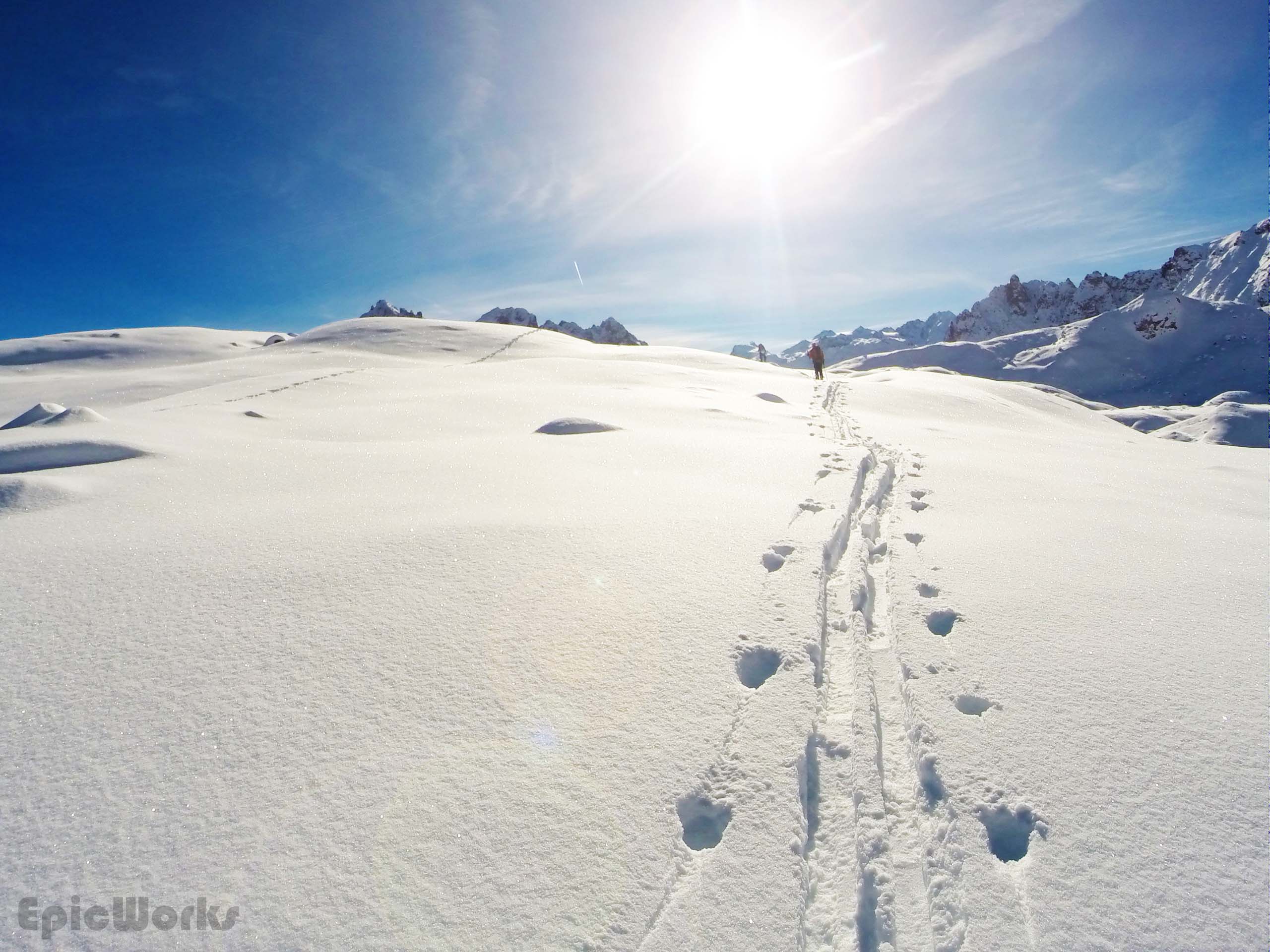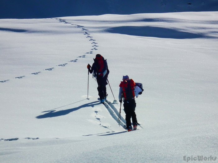 As we descended into the first valley we came across bare patches of rock and grass. With some careful manoeuvring we were able to continue without damaging the skis too much. As the hours went by we crossed a long flattish plateau, before arriving at the Col de Chanrouge which gives access to the next section. As we cleared the top, we could see a fox jumping through the snow. This explained many of the tracks we had seen earlier. Following the animal, we skied down without taking our skins off before continuing forward. By this point we had left the first refuge far behind and were heading towards the refuge de Peclet-Polset. This meant that we would have managed to gain a day’s march on the scheduled route.