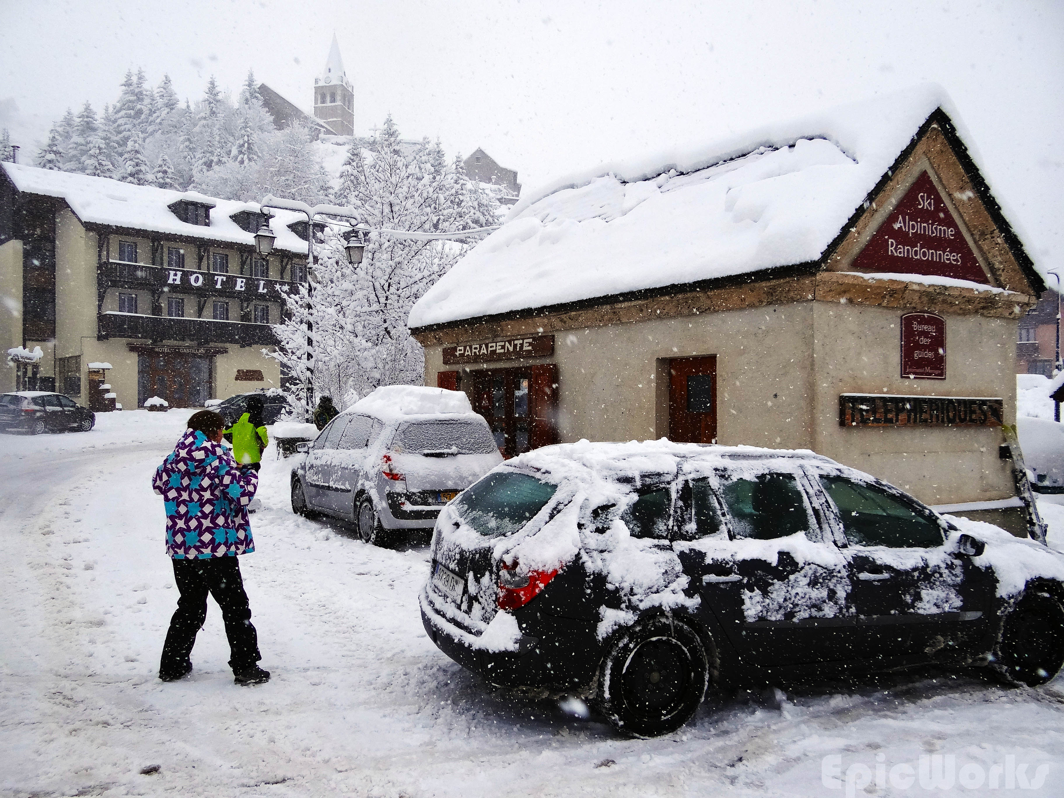 We were heading to an even smaller village just above, called les Terrasses. As we drove higher rain turned into snow and soon the countryside was white. Up and up, deeper and deeper snow by the sides of the road. When finally we took the last turning off the main road to start the twisting route before our destination even the four snow tyres started to lose traction. But with massive and perfect snowflakes falling everywhere we made. Unpacking all the stuff while looking out of the window and watching the snow accumulate was better than Christmas. And just like Christmas next day I was up before the alarm, impatient to see how many presents we had. A solid 50 cm of powder on roofs, cars and mountains was the answer. Incredible! Bouncing around the apartment getting breakfast and kit ready we tried to make plans. The big question was if La Grave was open, as avalanche risk meaning it could be closed. With everything ready we called T. who was making his way up from Grenoble and went out.