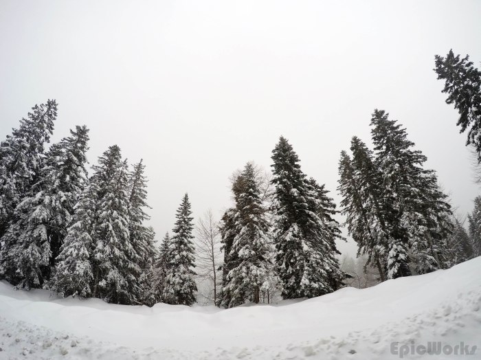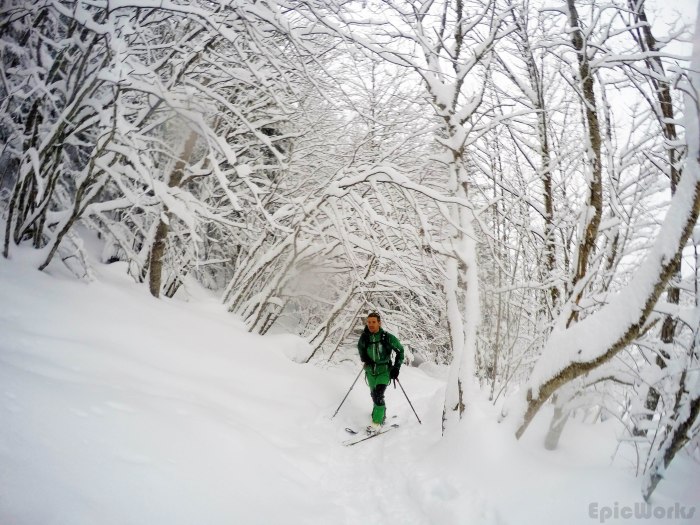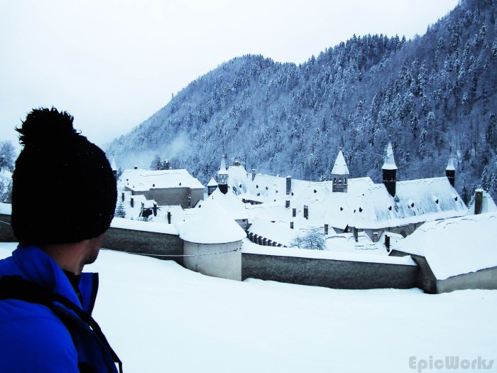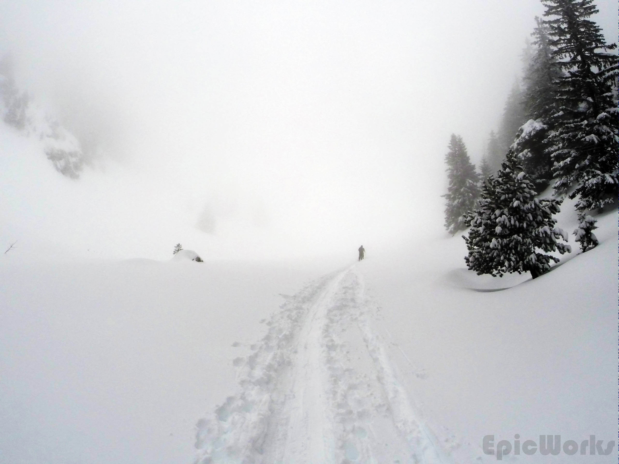 For the next round we were off to the Chartreuse. After a perfect outing a few weeks before (see Sacred Chartreuse) it was the logical option. JB joined us and we headed to the Chartreuse Monastery. We had thought of doing the Grand and Petit Somme, followed by the west corridor, but after encountering a couple who had just been taken out by an avalanche below the col de la Ruchère we decided to stick to the forests. This was good news for J as he still needed some practice on the turns! Our decision was confirmed as we gained height and the weather worsened, meaning it was pointless to try the peaks. So instead we headed down, out wind and into the labyrinth. It was the best choice, as with poor visibility we wouldn’t have seen anything on the high mountains. JB literally flew through the trees! After a first run we turned around for another dose.