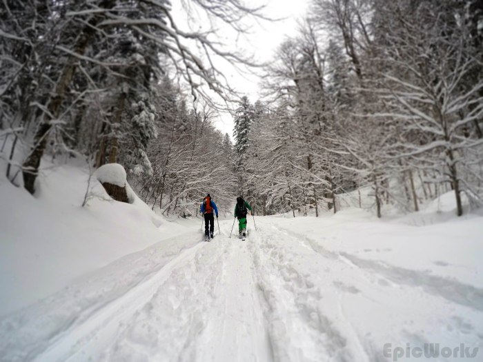 Change of scenery. Change of style. Gone was the sun and the high mountains. Come was the deep powder and the forests. We were back home, and arriving around mid-day just had time to drop some of our kit and head back out again. Grabbing a bite to eat in the car, we head up into the Vercors. With a few hours of sun left we lost no time and were soon climbing through the fresh snow, which kept falling around us. Getting high enough for a good run, we turned around and made the most of the last light. It was J’s first taste of forest ski. Probably the most different from classic piste skiing, it demands quick turns and sharp reflexes. But not to worry, as there was plenty more practise coming!