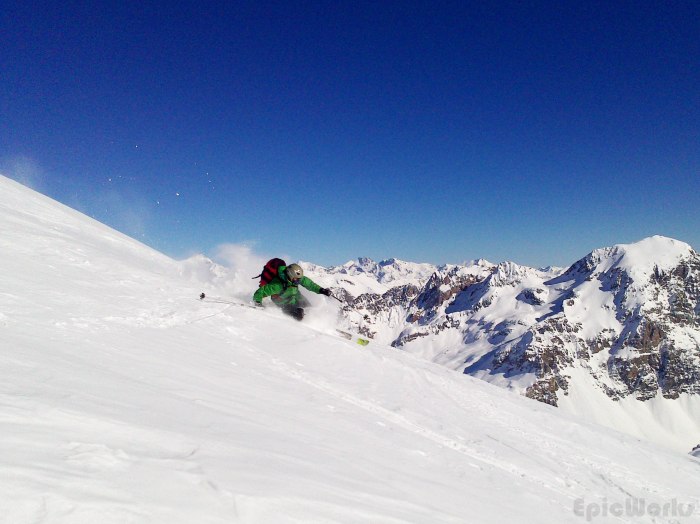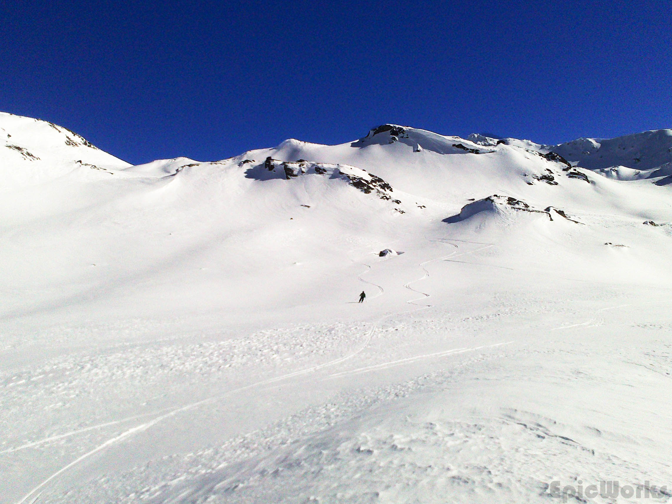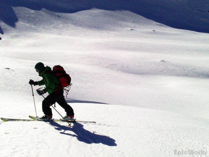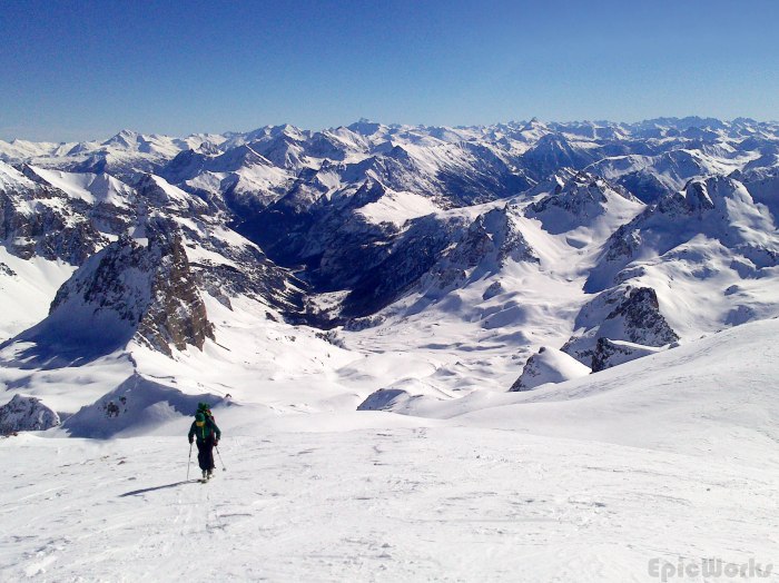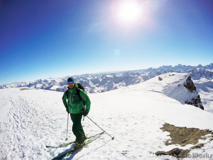 So to cut a long ski short, we climbed it! Having been training all week, I was in pretty good shape and really enjoyed the uphill, while J made a great effort considering it was his first rando. Approaching the final summit, the landscape was more than enough recompense. To the east we could see the Italian Alps, south the characteristic sharp peaks of the Ecrins scraped the sky while in the north the rounder Vanoise was clearly visible.