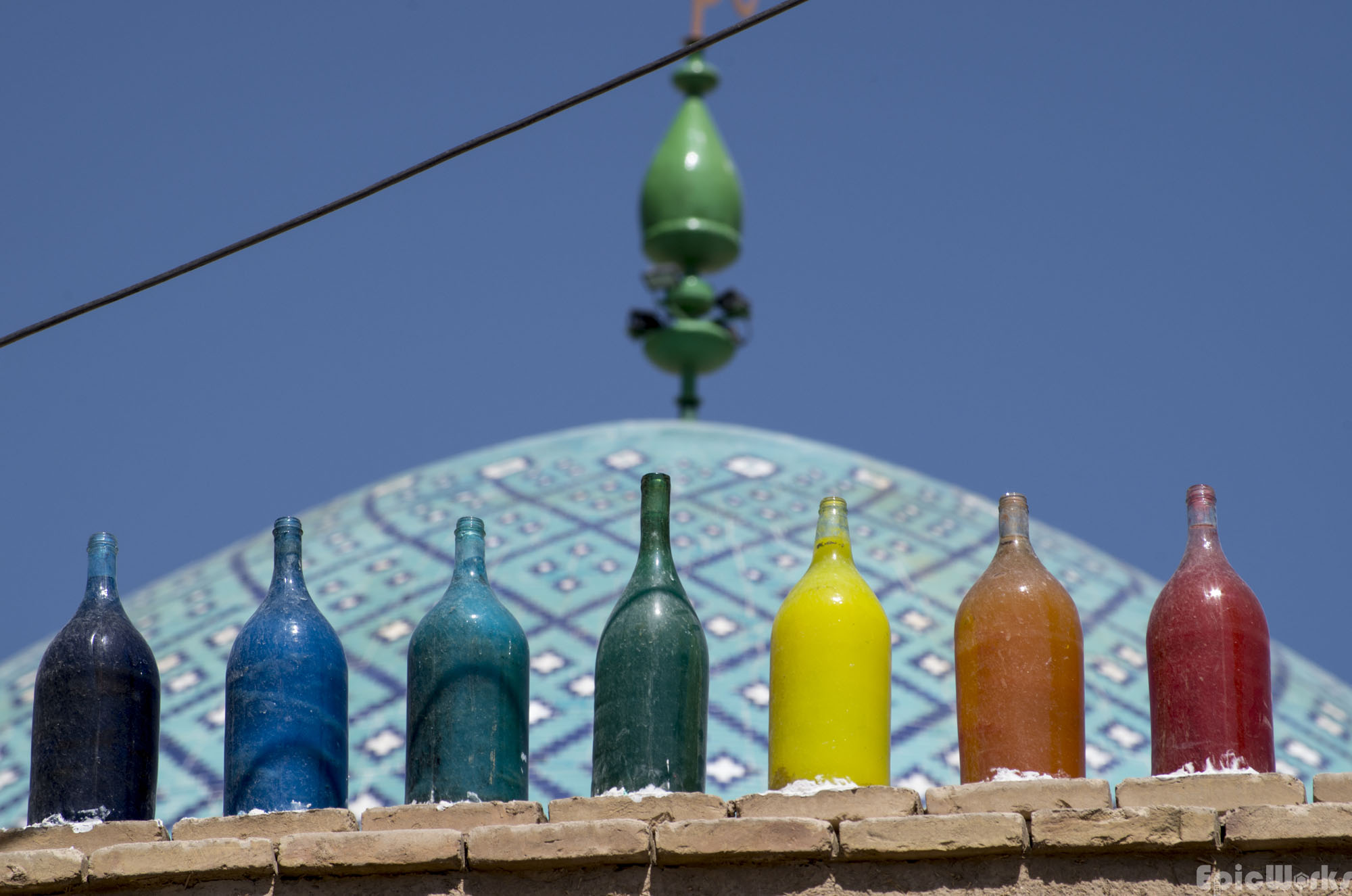 5 coloured bottles sitting on the wall….