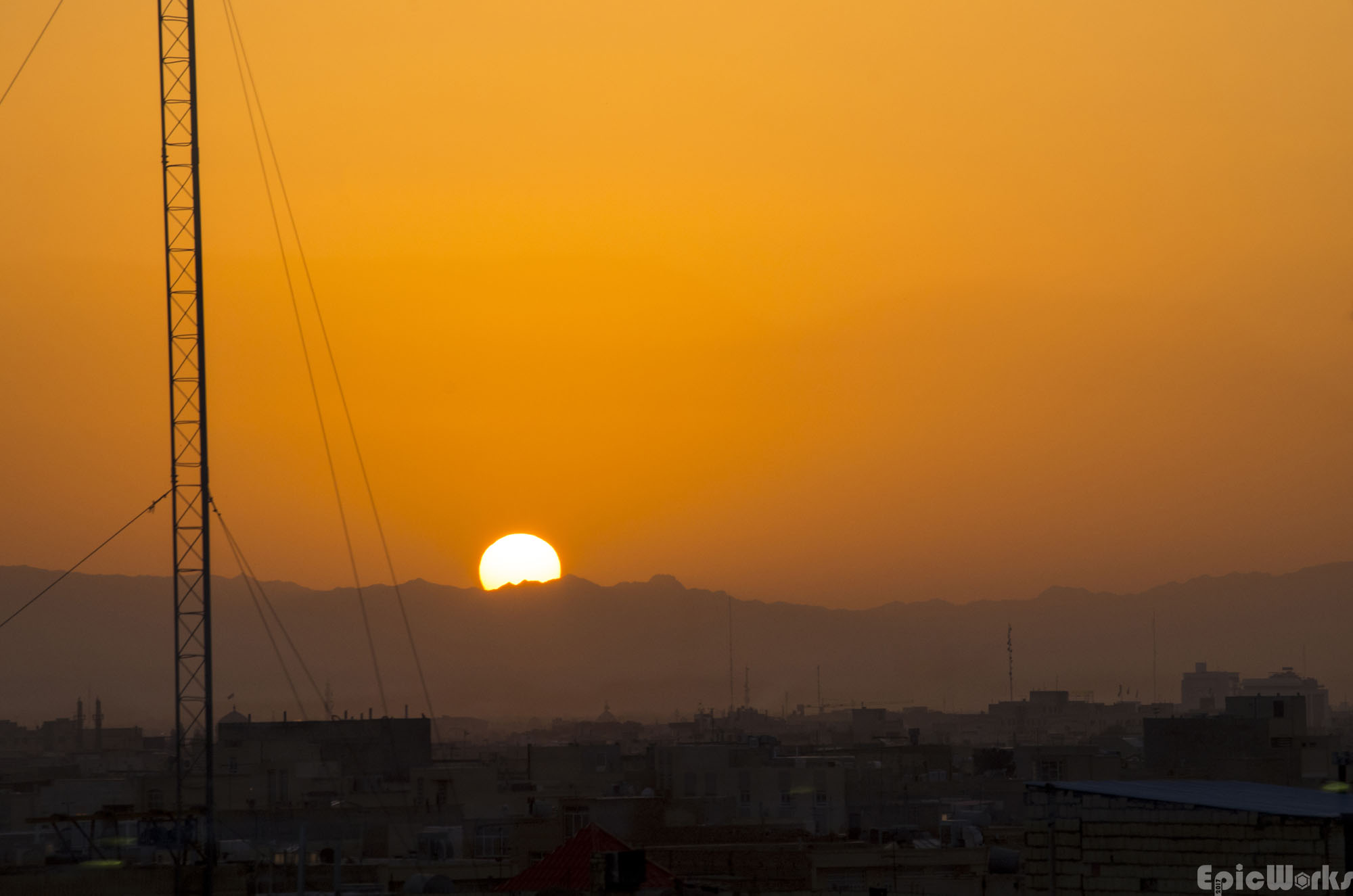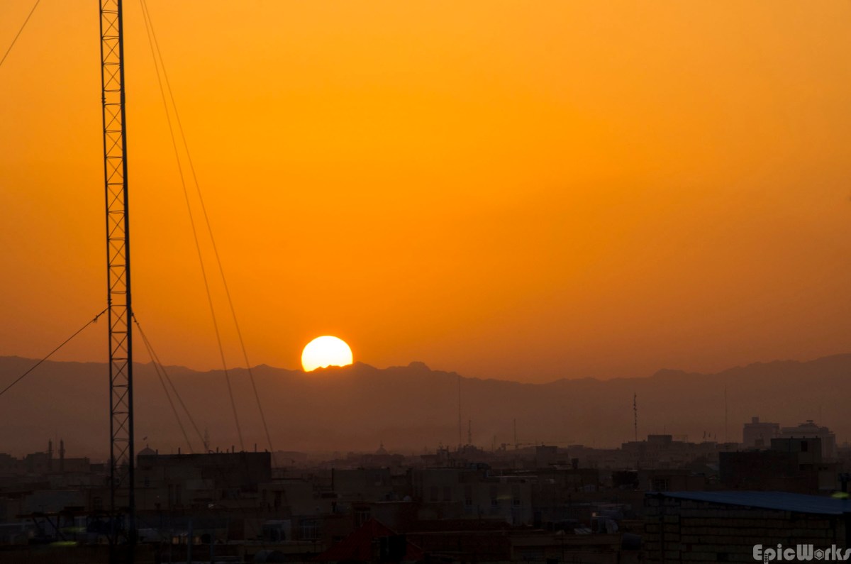The sun rises above the little city on the edge of the desert