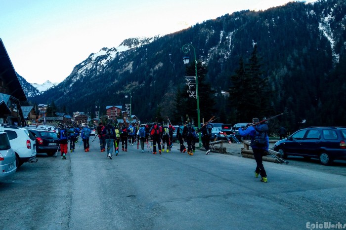If we had known all this, Kike and I would have been much less surprised to find a hoard of skiers on what we were expecting to be a quiet parking lot. Congratulating ourselves for having chosen the best snow conditions (why else would there be so many people?) we soon found out otherwise. We were presented with a dilemma: to stick to our original plan and ski up the Cime du Grand Vallon, or to try and catch up with the group that was leaving at that very moment and participate in an unknown adventure. And as improvisation is the name of the game, there wasn’t too much to think about! We were soon pulling our gear out of the car and paying the subscription fee. Having been told we really must hurry to catch the cable car and the start of the traverse, we were soon running with all our kit, while I half-choked on one of the croissants that had been kindly offered to us by the organisers. Already sweating, we clambered into the cable car and realized we were still carrying ice-axes, crampons and all the other stuff you don’t really need for a route where the only important objective is to get to the end on time. During the ascent, we quickly prepared our stuff and were almost ready when we reached the top of the slopes.