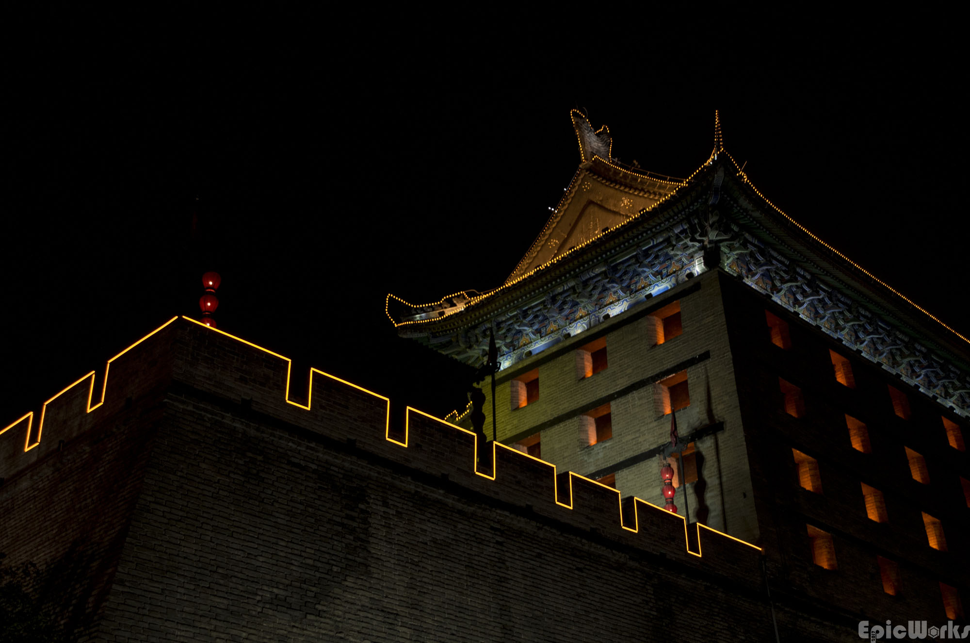 The huge walls are lit up.