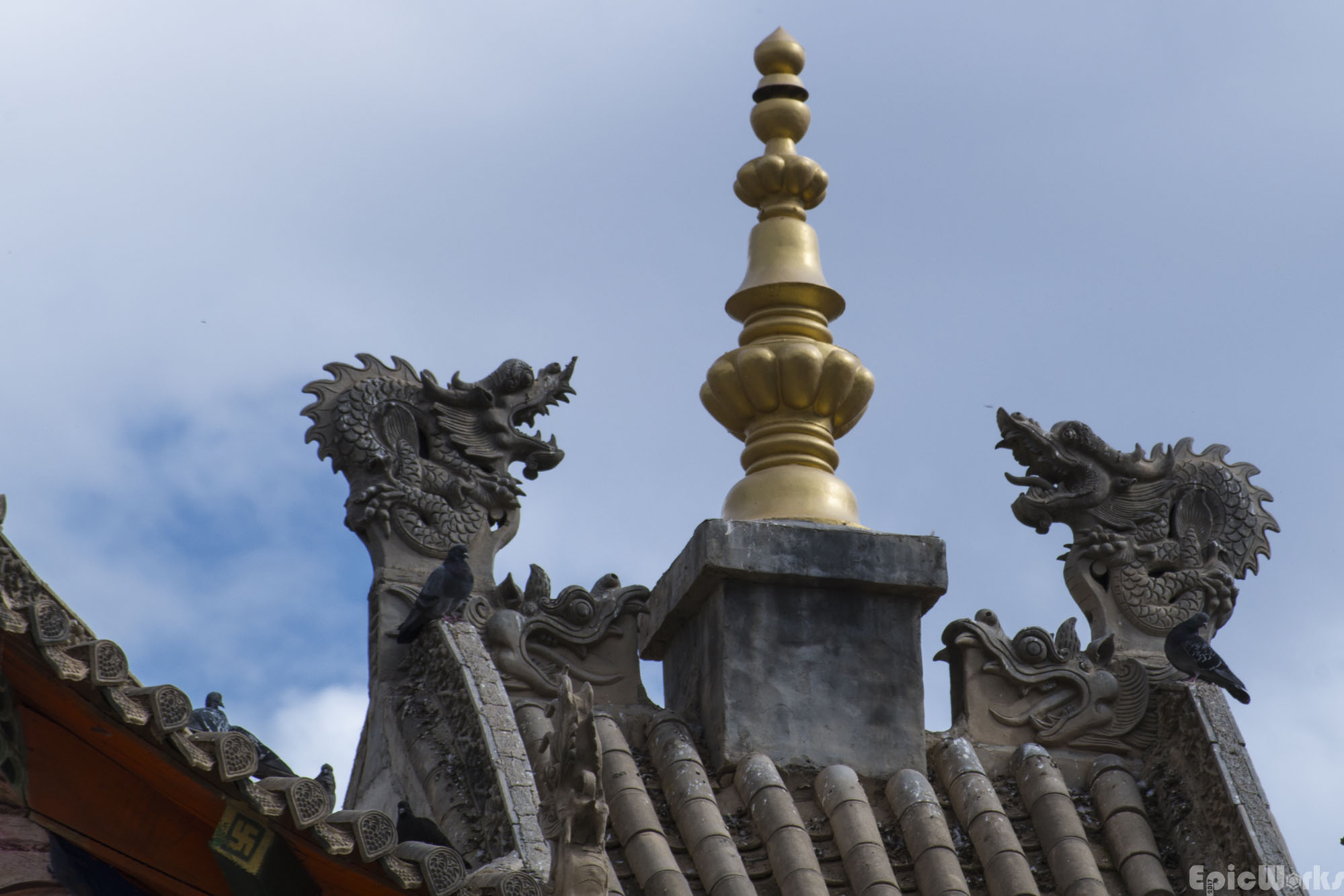 The dragon decorations above the temple