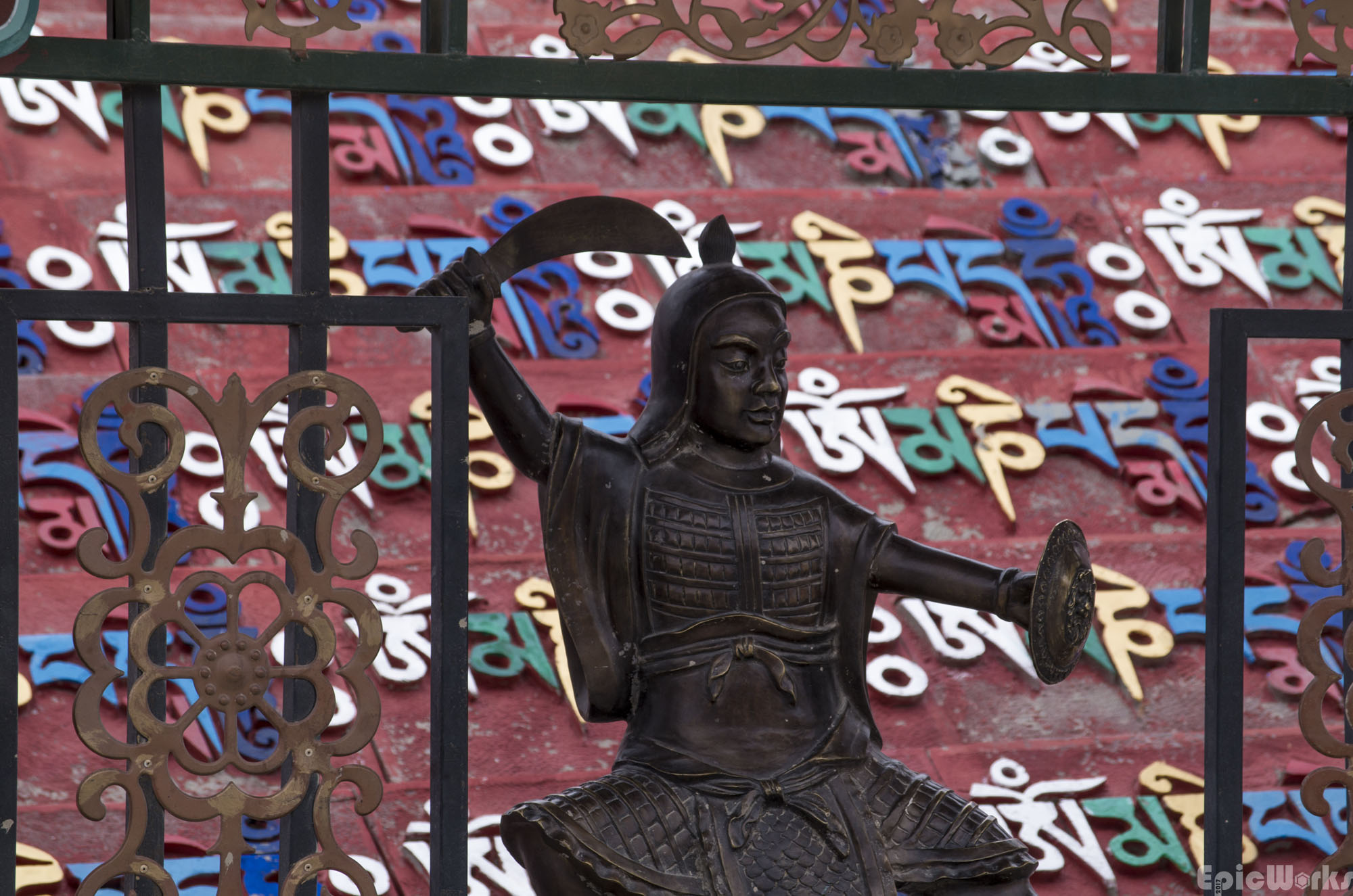 A statue with lines of tibetan script behing, decorating the huge (and new) temple in Madoi