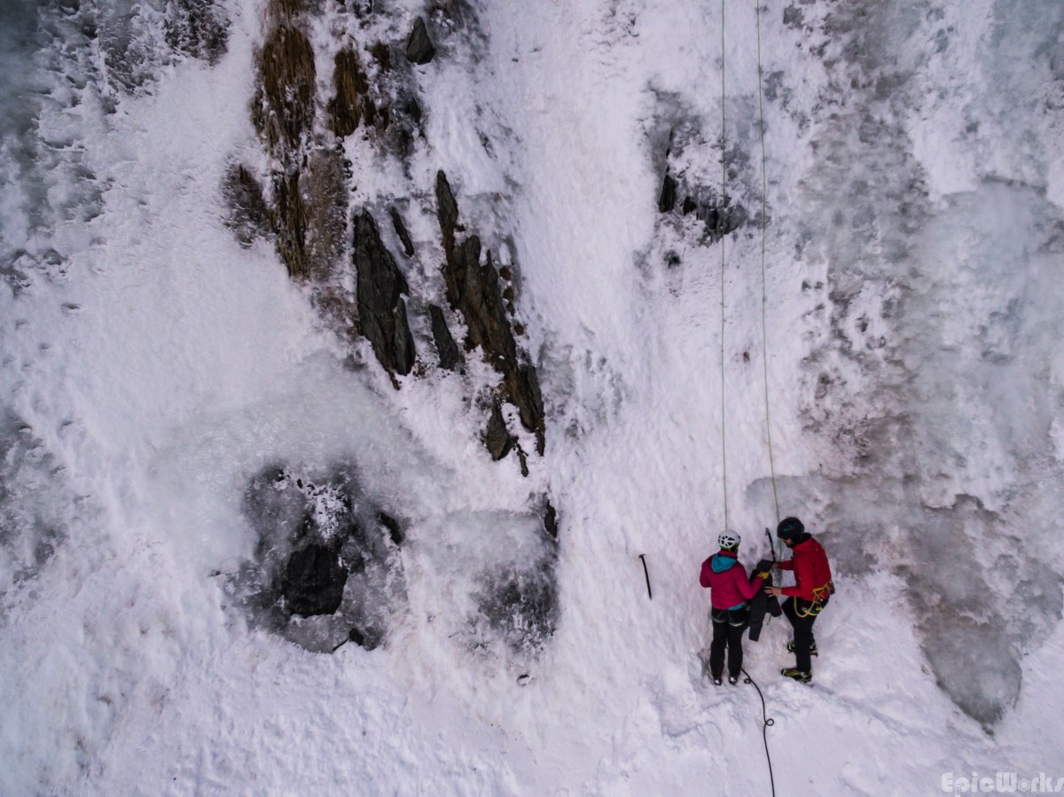 Crouching to the side of some spindrift that has just come down