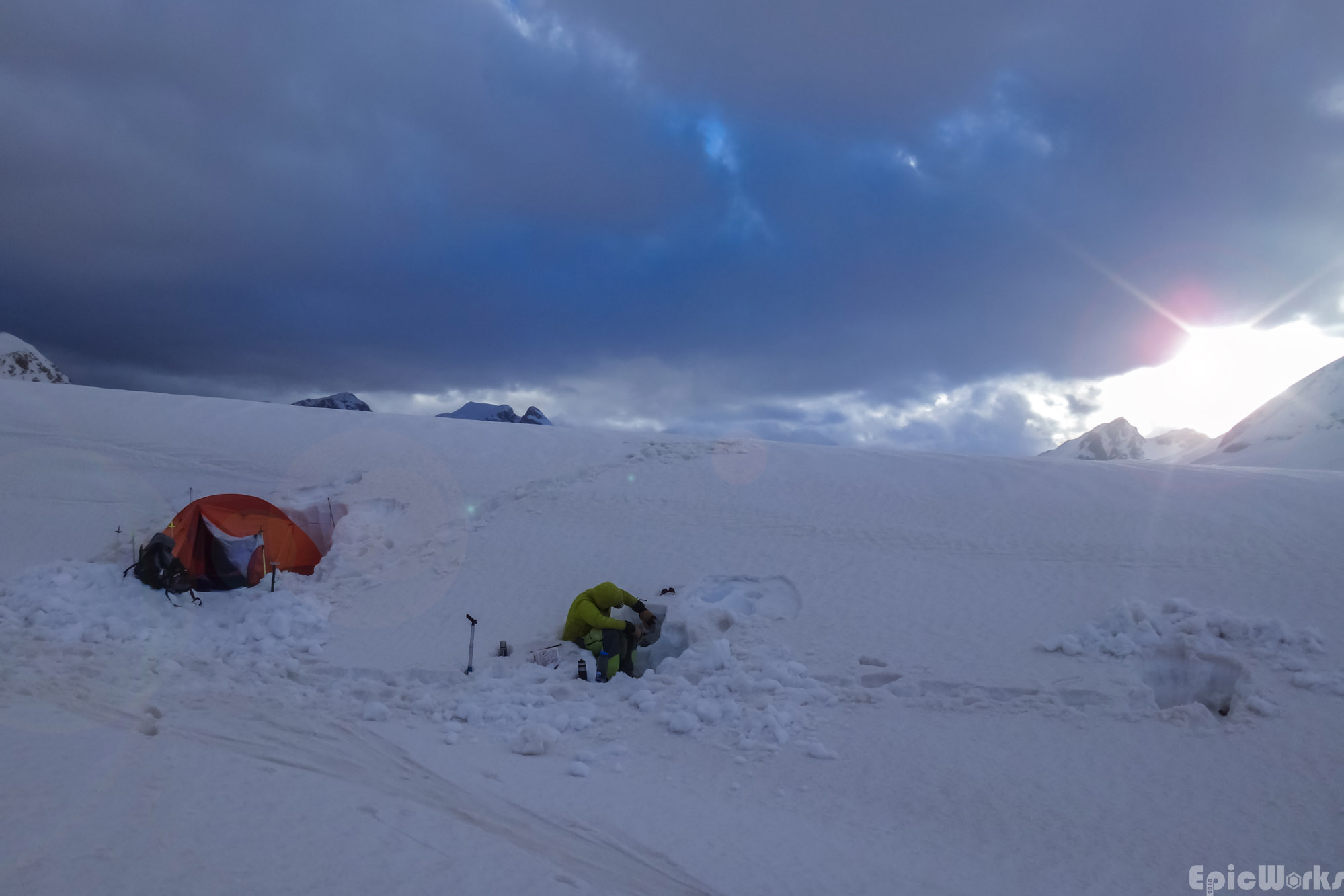 Our camp, myself checking the snow as it melts on the cooker (courtesy JB Cazaux)