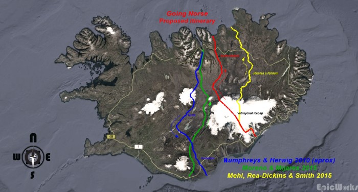 The choice of location and itinerary for this journey matured slowly out of multiple desires and objectives. Having visited Iceland back in 2012 I had already experiences some of its beauty, landscape and difficult weather. It was a cathartic experience and some of my fondest memories are from that trip. I had never before been so cold and wet for so long. Since then I have completed other trips into the wild, often in more extreme conditions, but that first taste has remained very special. Having one of Europe’s largest glaciers (1) and the abundance of wild rivers that traverse a large part of the country was clearly a bonus. The Islandic countryside presents the perfect playing field for the type of expedition we want to complete. It is a challenging environment in which to complete our goals of a multi-sport, unassisted tour, as well as a training ground for future polar expeditions. Our proposed route has slowly evolved but is (to us) an aesthetic line across the country which will hopefully expose us to both its most beautiful and demanding regions.