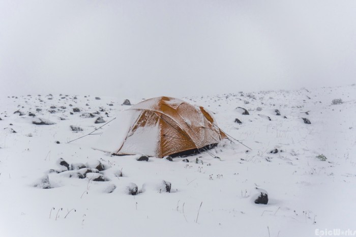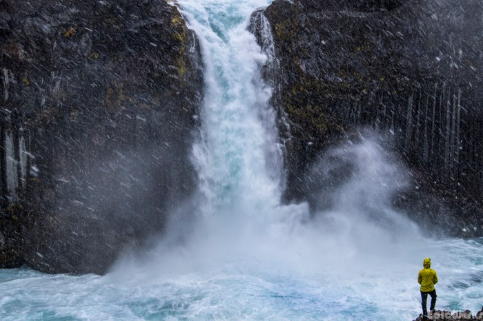 Continuing up the valley, we stopped at a farmhouse and were kindly invited in to dry and have a bite to eat. The owners told us that the winter storm was in fact unusually early and that they needed to get their sheep in soon. This information, backed up by an online weather report comforted us somewhat. At least we could put our progress so far partly down to bad luck rather that over-optimistic planning. With this information and much drier we set up camp that night at the beautiful Aldeyjarfoss waterfall. Having risen above the snowline, the white flurries mixed with the spray that rose from the boiling cauldron at the foot of the fall. We admired the spectacle of raw power before settling down. Camping in the snow was much easier, and we managed to keep relatively dry.