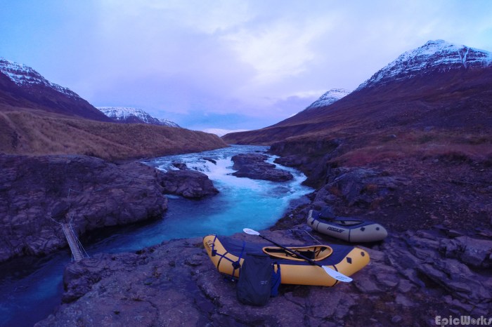 The Fnjoská is a beautiful river that is born in the long valley of the Bleiksmýrardalur. Its water is crystal clear and as it flows towards the sea though the Fnjoskaladur valley there is a section of wide, meandering curves between fields. It is then slowly surrounded by snow-capped mountains and as it reaches the ocean, just south of Grenivík, it becomes narrower and picks up speed. There is a perfect section of rapids, just before the bridge coming from Akureyri. It was on the Fnjoská that we fell in love with Icelandic pack rafting!