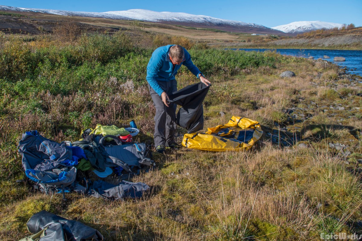 Preparing the gear to descend Fnjoska, a lovely river in the north of Iceland, on a sunny afternoon.