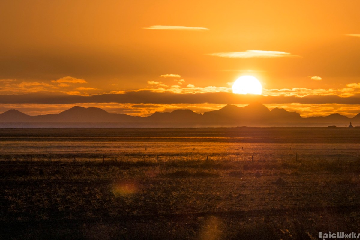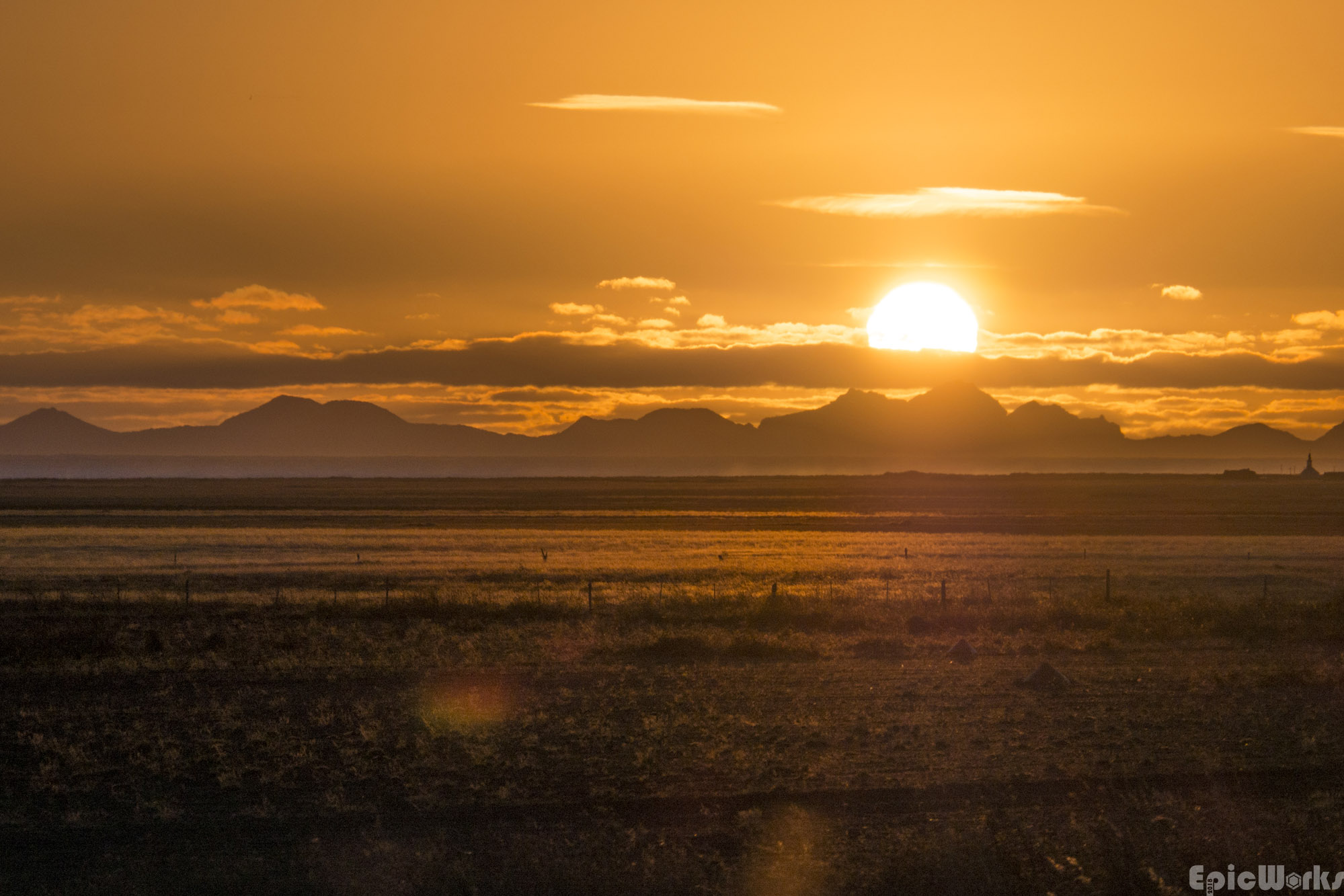 The sun sinks behind the Westman Islands, as we head back along the south coast