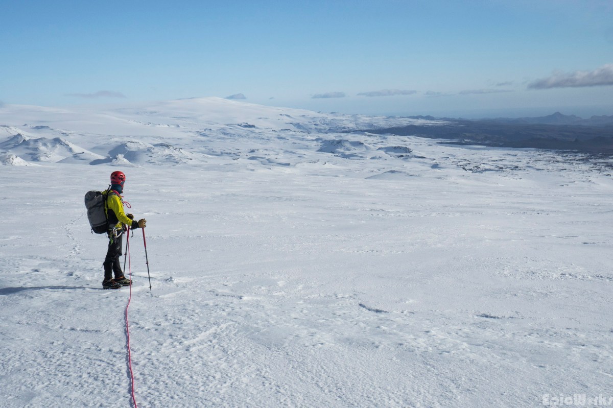 Looking back, the Mýrdalsjökull glacier can be seen streching out over the mountains behind us