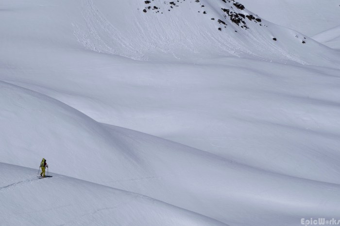 From the peak we skied down, passing huge blocks of ice, the tormented shapes of seracs giving way to open crevasses. The glacier stretched out in front and we didn’t hesitate. Picking up speed as we reached the flat surface we streamed out across its immensity. Our legs started to ache as the snow beneath the skis kept moving and our small shapes, lost in the huge valley inched their way across. The slight incline gave us enough momentum and after an eternal crouch we slowly came to a stop. Several kilometres in one long push. We only had to skate a few hundred metres to the large rock that would protect us from the midday sun while we ate and waited for things to cool down.
