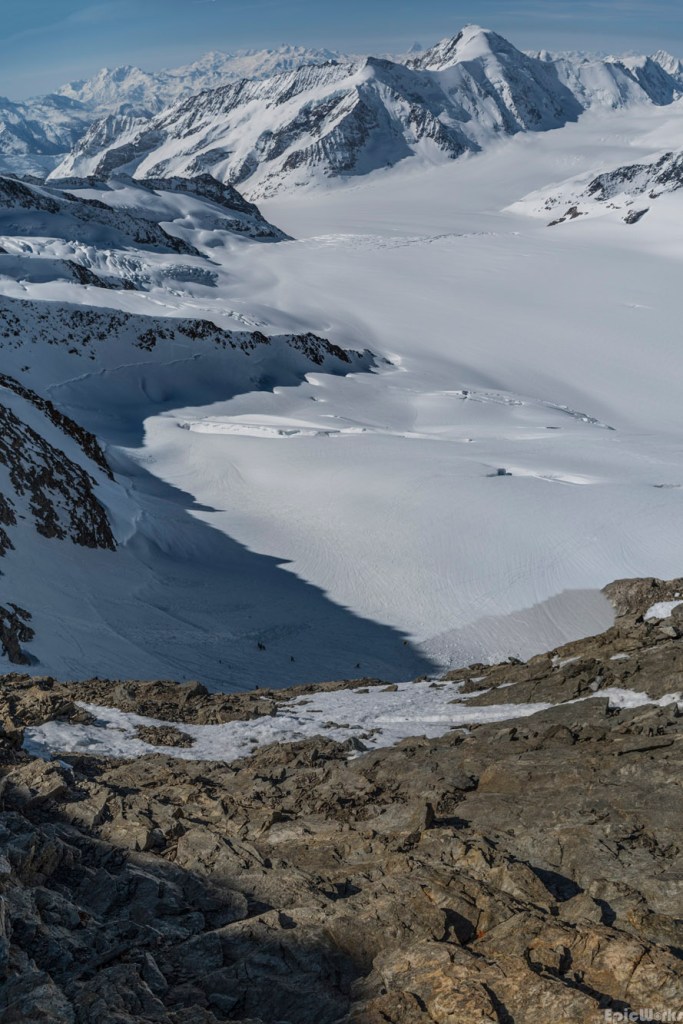 The departure was rushed, and in the early morning stupor I forgot my toiletries. That would be something less to carry as we headed for the Fiescher glacier. Before us the Finsteraarhorn rose up like a huge pyramid. Another argument ensued on how to contour the ridge: either ski right around it or take the small steep corridor that shortened the itinerary. We ended up doing the second and soon watched FX disappear down the bumpy slope showering tinkling shards of ice. Nic and I strapped on crampons to descend the hard packed snow. Sweating as I reached the bottom, the view in front was epic. The Fiescher, although smaller than the Aletch, is still impressive. It would become the centrepiece of our tour. From the base of the couloir we climbed the Wyssnollen peak just in front of us. Still very tired from the previous day’s efforts I reached the summit slowly, struggling for breath.