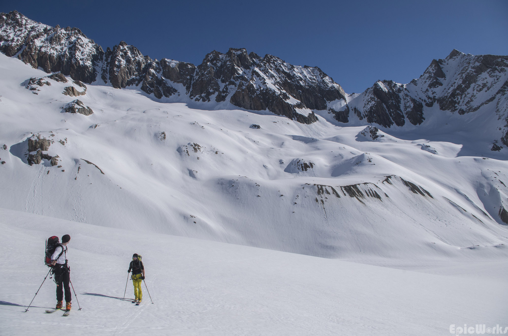 Looking back at the pass, the coulouir we have just descended
