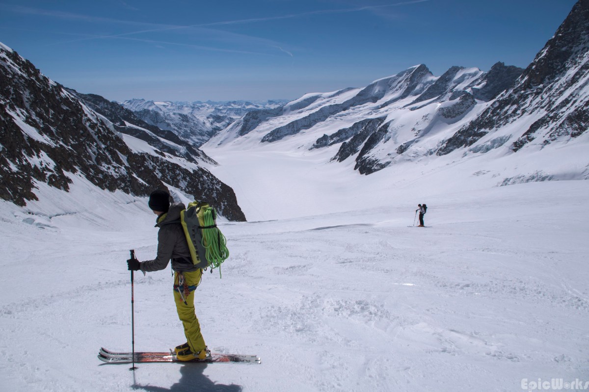A beautiful descent, the Fiescher glacier stretches south