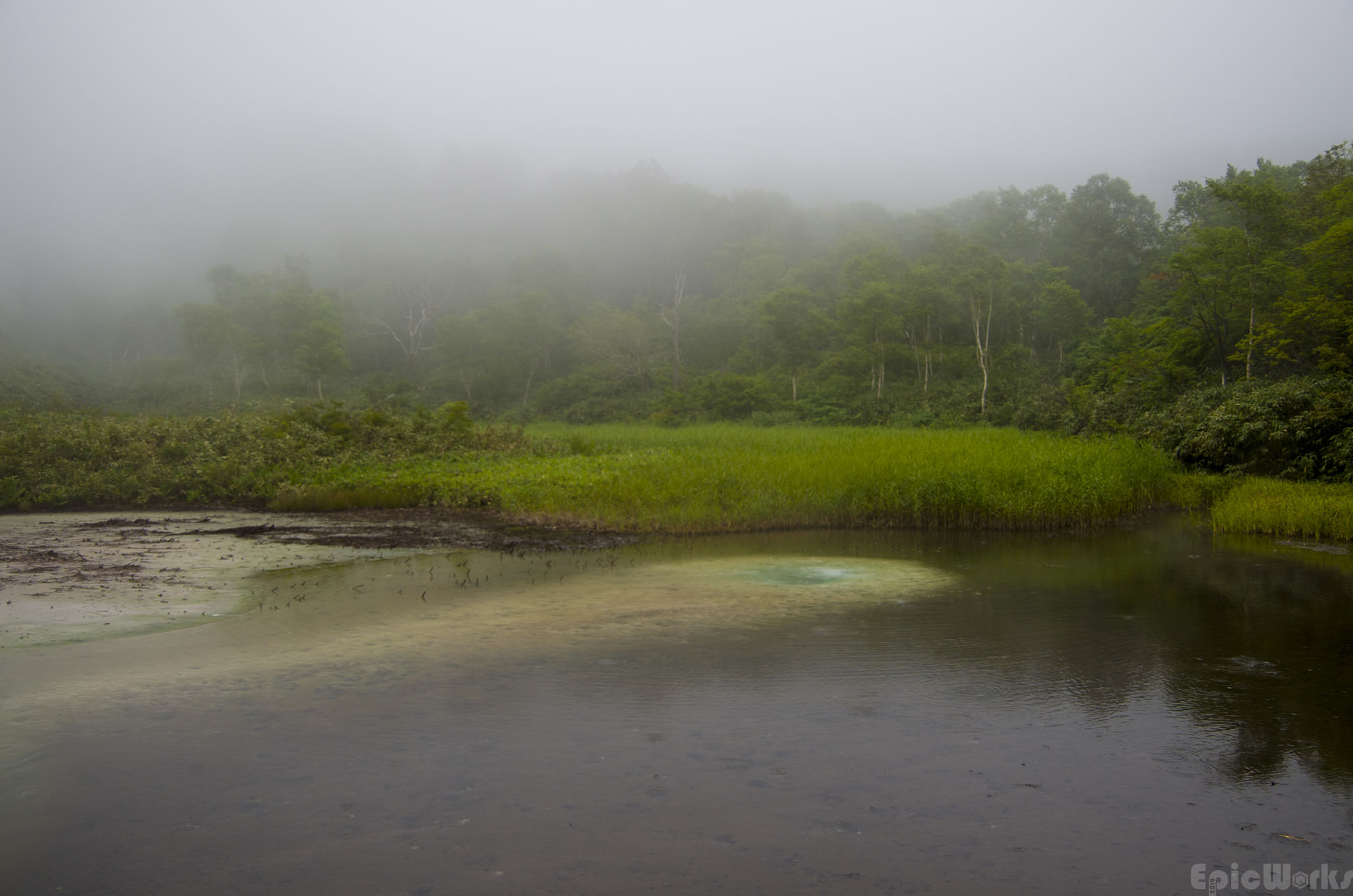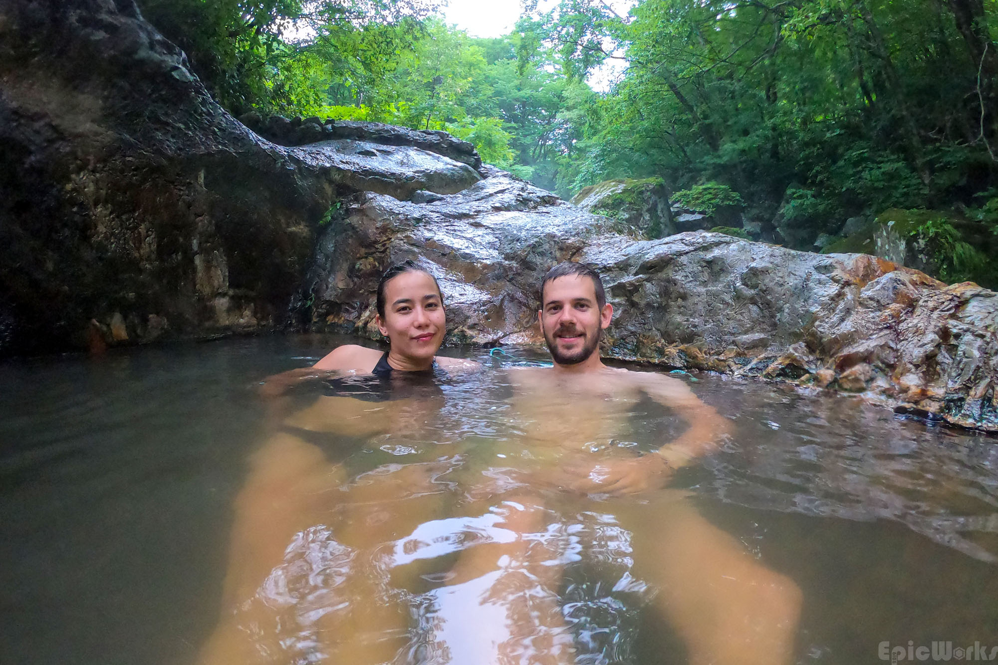 One of the words that you quickly learn in Hokkaido, or Japan for that matter is onsen. They are hot natural springs that tap in to the active geology of the islands to give a relaxing, cleansing bath. In a country where bathing is an institution Hokkaido’s volvanic landscape is an excuse to get naked and enjoy. We had already passed many of the huge buildings that have sprung up and enclosed these natural treasures but we had set our hearts on something more special. Hidden away in the mountains some simple and free hot pools can still be enjoyed under the foliage. On yet another wet and grey day alone on the west coast we turned off the main road and attacked a steep climb into the mountains. A river churned down the gorge that we crossed, high above. Following it up, into ever deeper forests we reached the end of the road. From here we continued up a dirt track where smoking sulphur coloured rocks told us we were near. A small path descended towards the crashing torrents below. A wooden changing room, complete with a moss covered roof was the only amenity. A few more steps and a basin, chipped out of the rock, was filled with steaming water. Just behind, a crashing waterfall added a dramatic backdrop.