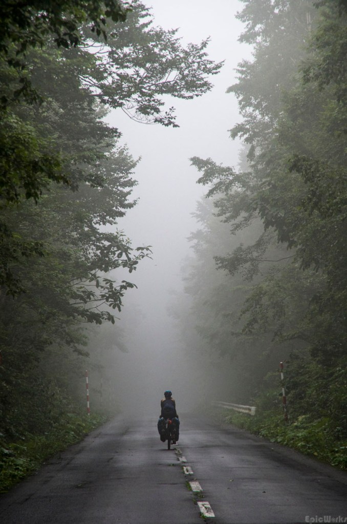 Over the course of the next few days we continued through lush vegetation and volcanic lakes. After Shikotsu the road took us to lake Toya. This ancient cauldron encloses two islands and has some nice sandy beaches. We camped on one before continuing towards Hokkaido’s very own perfectly conical volcano: Enzo Fuji. It was an elusive mystery for several days, wreathed in mist, only giving us a glimpse of its silhouette just before our departure. It is the main icon of the famous village of Niseko, where skiers flock in winter to taste the powdery snow.