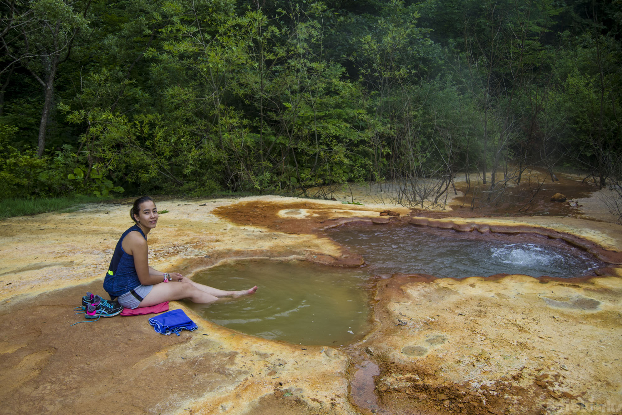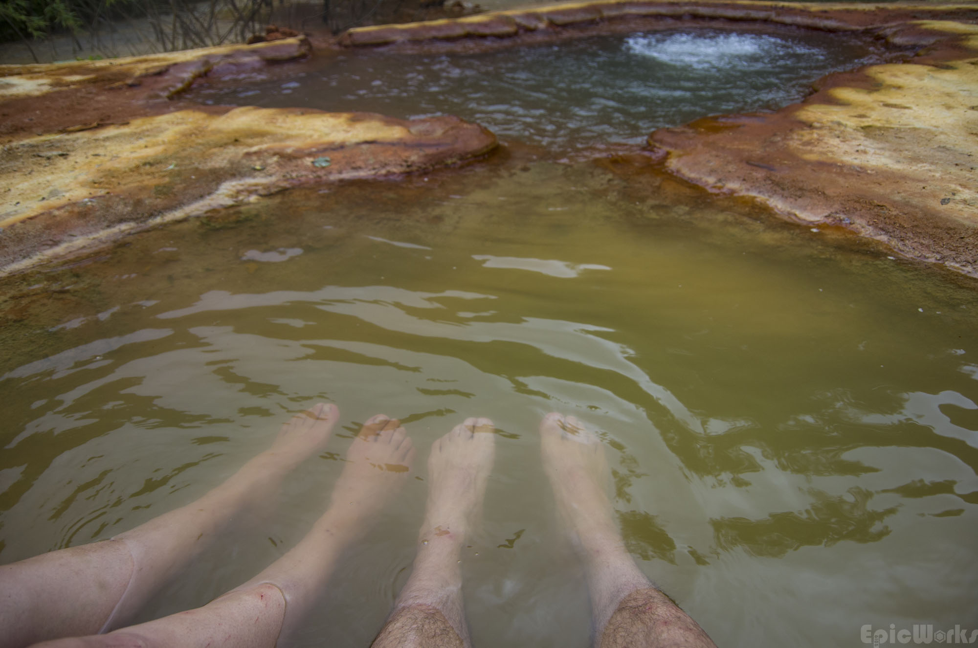 Wanting more, in the morning we decided to try and find another spring which is more remote. Pedalling up a dirt track we found the bubbling pool, yellow and red from the water’s deposits. It had not been used recently so we had to clean off some of the scum and dead flies. Seeing the bubbling water and its smaller size we decided not to go in completely but it made a great foot bath!