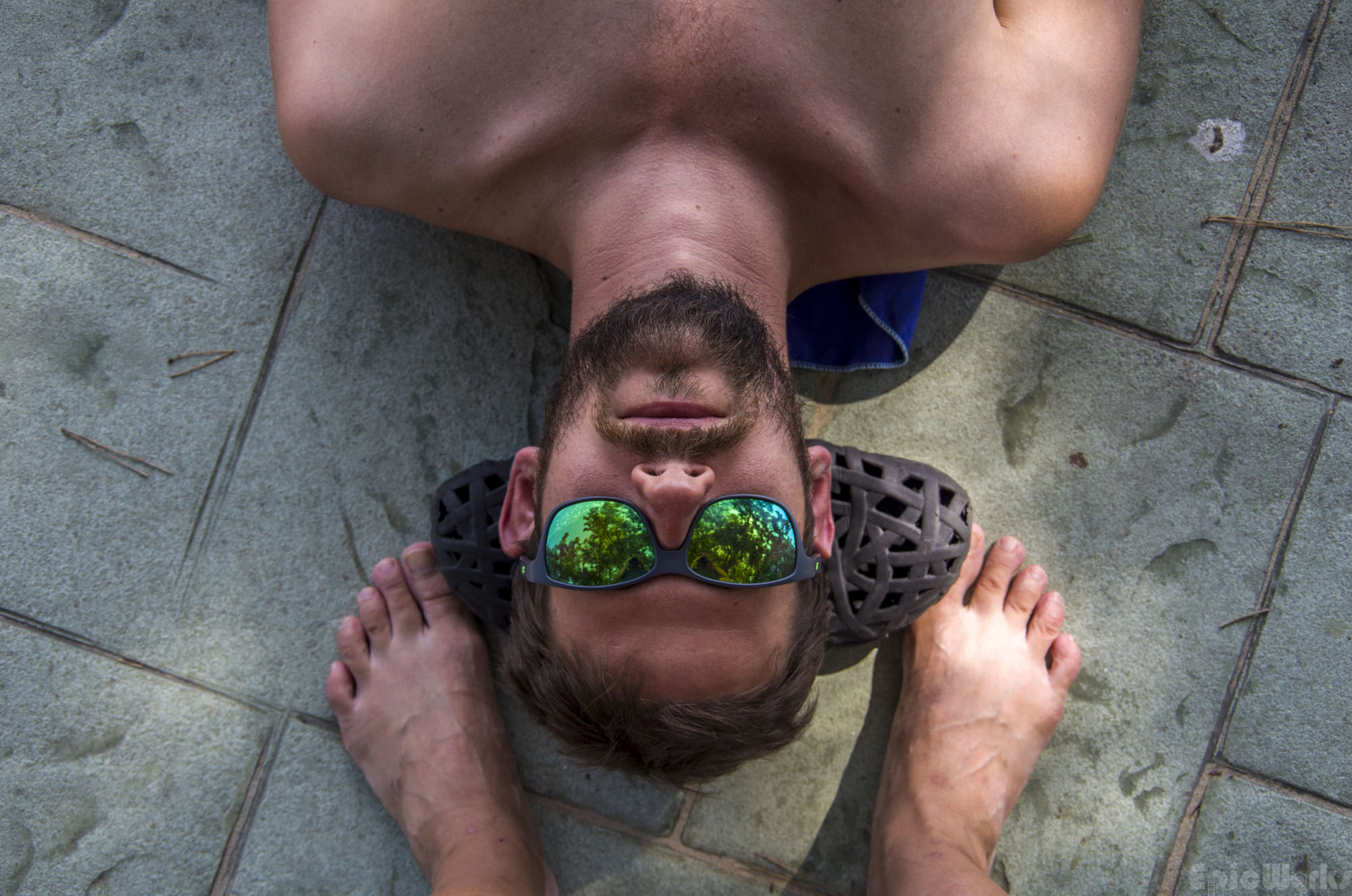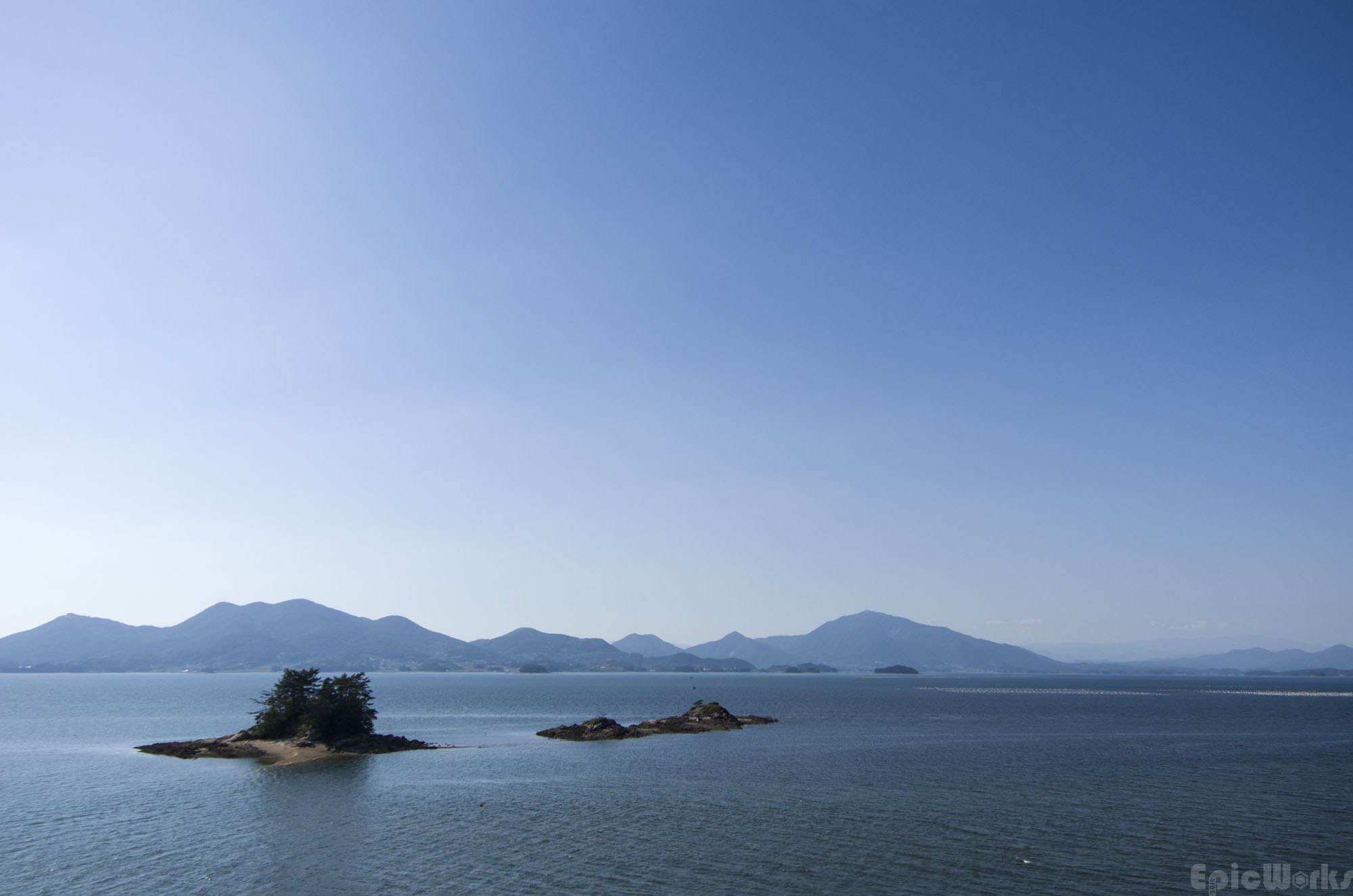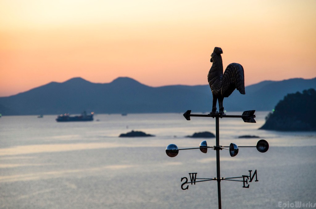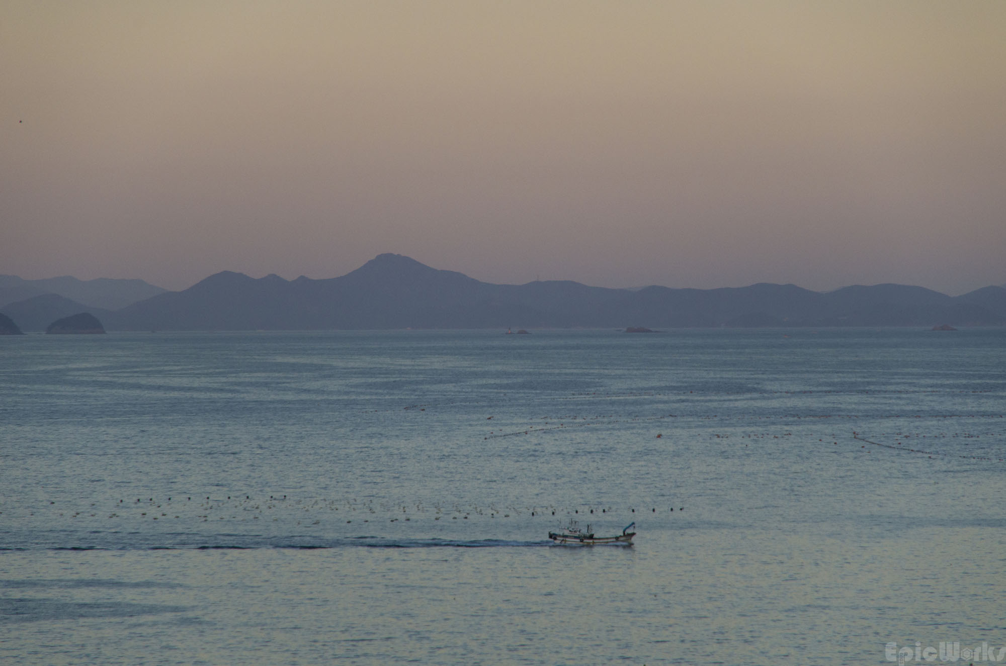 As the day came to an end the heat started to fade, and the evening colours crept into the sky. We crossed a bridge from which we could see the traditional fish traps, the currents flowing around them. We slowly ran out of time as we stopped at the end of the island, watching the fishing boats making their way back to port. That night we set up our tent by the side of the road, the cliffs falling away from our look out point into the pines and then the sea.