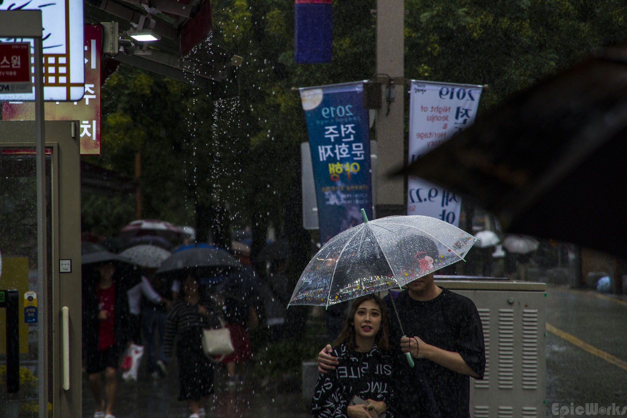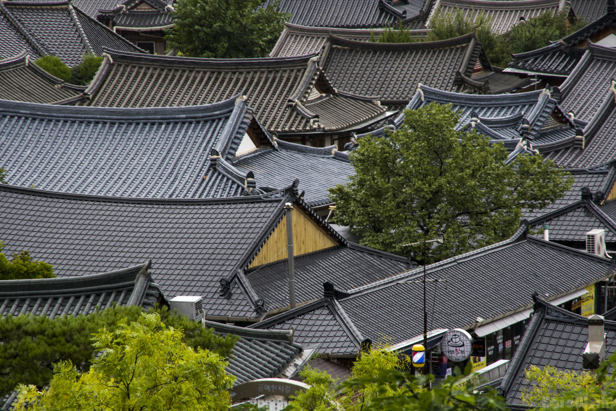 Arriving in Jeonju we were visited by our third typhoon. We had weathered a small one in Busan, but this time the rain was torrential. Luckily the wind was not too strong and we were able to go out to visit the traditional houses or hanok. As we stepped into the downpour we were greeted by a humid smell and the sickly odour of the ginko berries, crushed into a yellow mass on the pavement. They were everywhere and the flooding water was starting to push the saturated mass into piles that blocked the sewer entrances. The streets had started to fill with water and we squelched through the puddles on our way to see the cities highlights. These are found in the small, traditional district, that still conserves over 800 hanok houses. Like similar venues around the world, many of the older businesses have been taken over by restaurants or gift shops to cater to visitors. Unfortunately this decreases the charm but there is little to be done. Because it was raining, the streets were emptier than usual and as we climbed the small steps up the park above and we had the place to ourselves. After, descending back into the small streets we came across the fan museum. We were blown away by the intricate designs and learnt how the different models were made from split bamboo before the paper and finally hand painted motifs were applied.