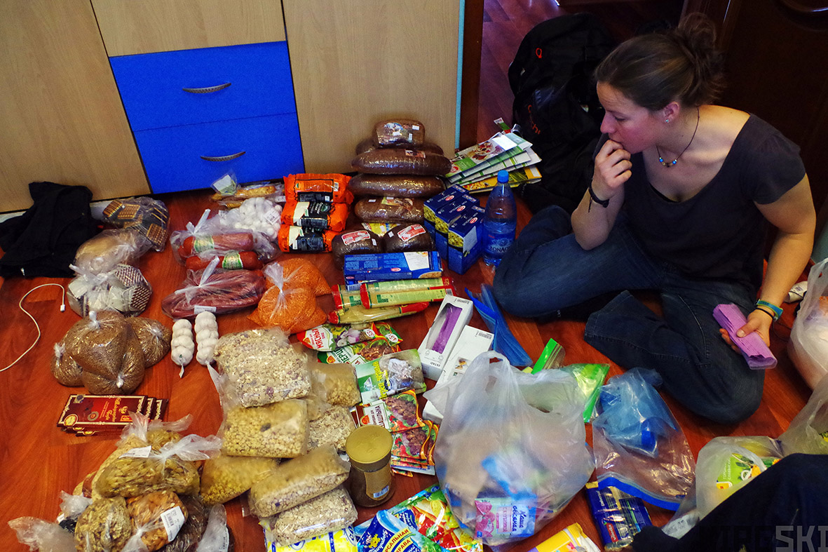 Organising the rations Bishkek, Kyrgyzstan. Sev goes over the different food items and starts organising everything into meals.