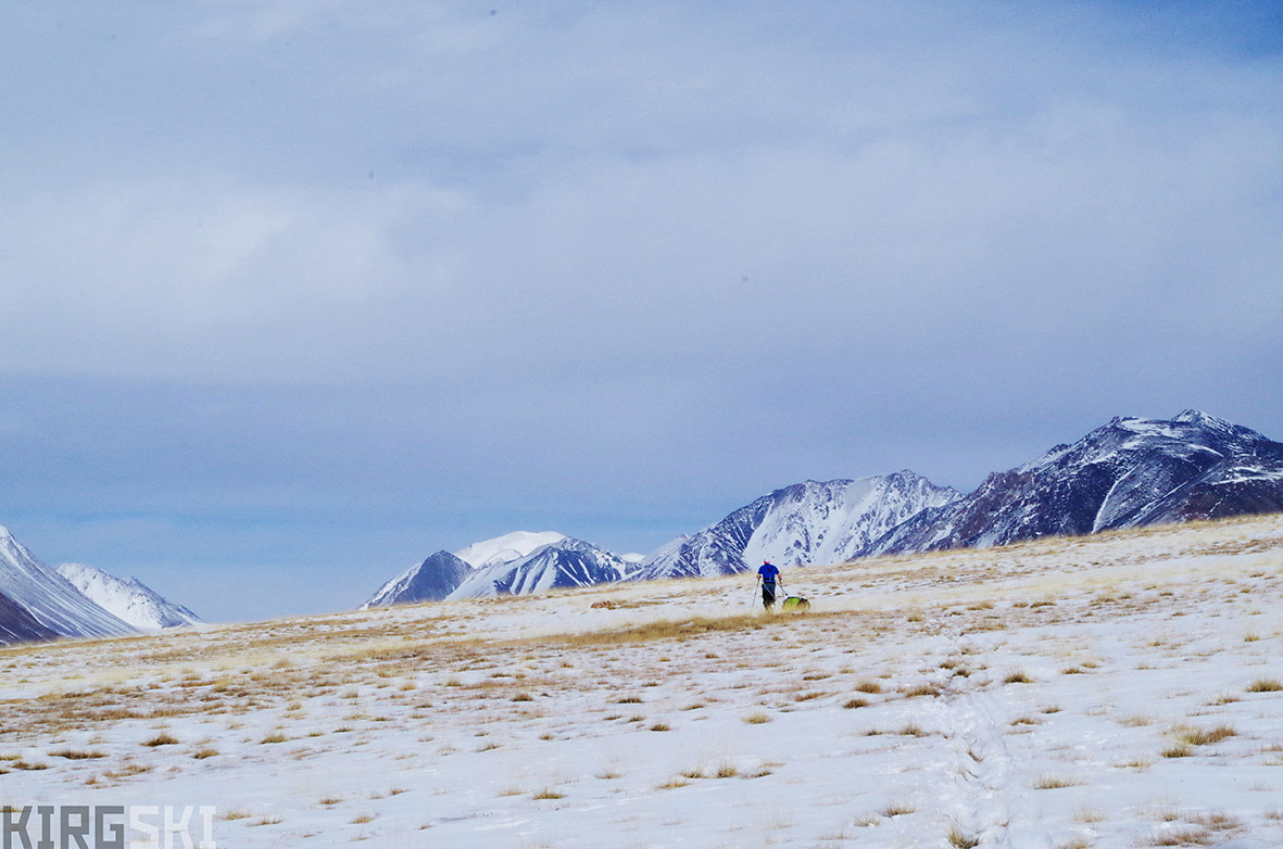 Grass sledging Kara-Say Valley, With very little snow cover we start pulling our sledges over grass and mud. Luckily they slide quite well.