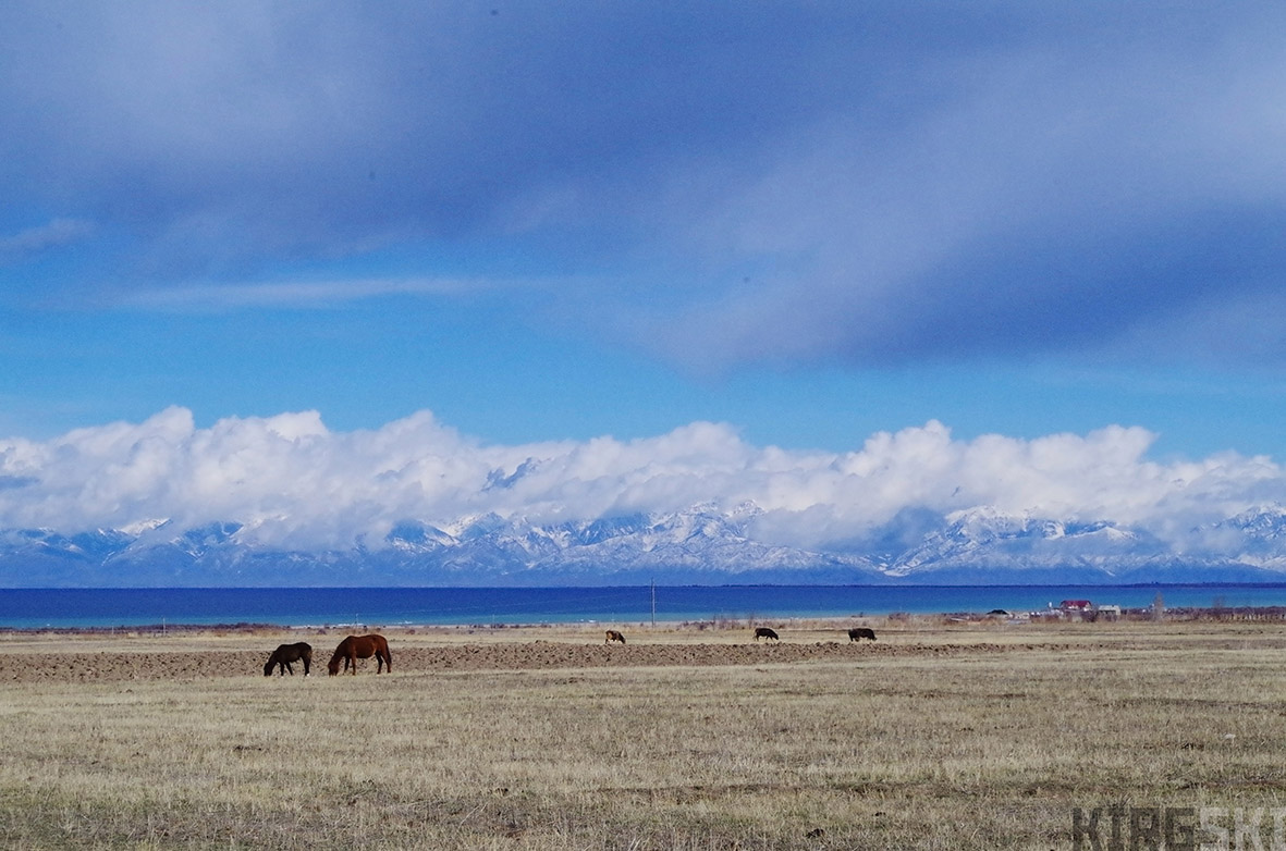 Panorama of lac Issy-Kul and the Kungey Ala-Too Road A363, Issyk Kul Oblast, Kyrgyzstan. Heading towards the Suek pass we watch the horses grazing in front of Issyk-Kul lake.