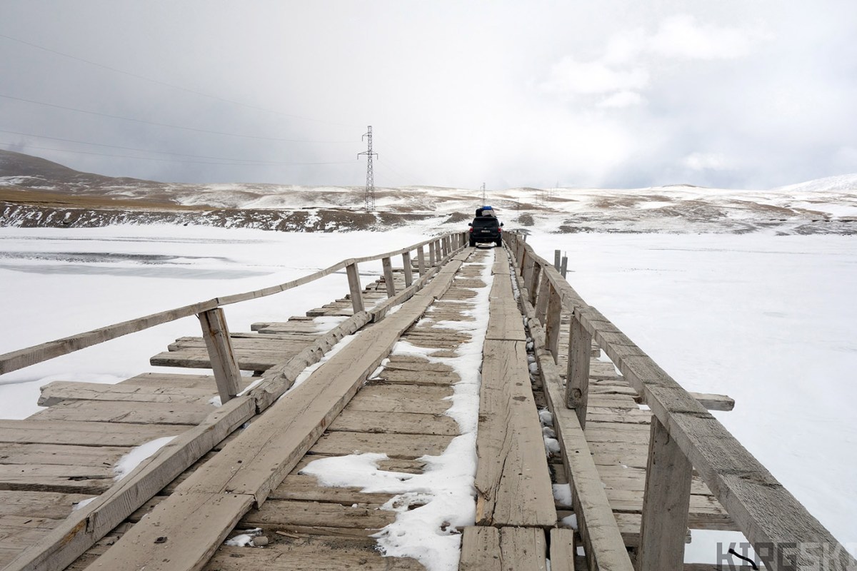 Crossing of the Kara-Say river Kara-Say bridge, road A364. The bridge crossing the frozen river has been mended and it allows us to gain the east side and keep heading up the valley.