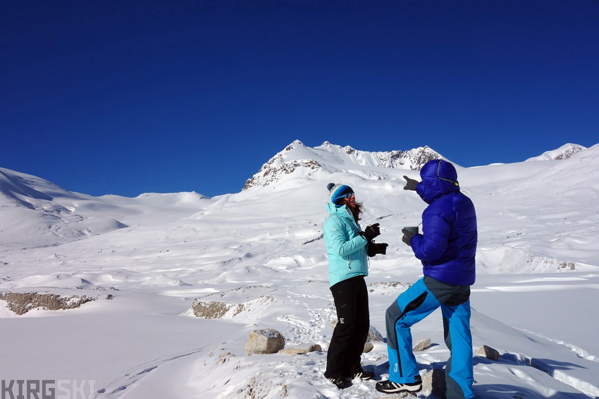 Breakfast and plans. At the foot of the North Kara-Say glacier. Arnaud and Sev discuss possible ascent lines having breakfast.
