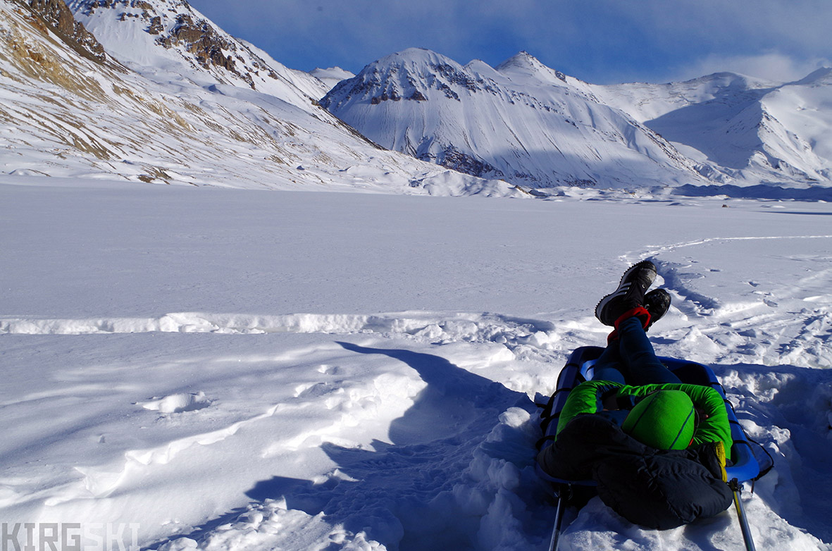 I chill out in my sledge Even with negative temperatures most of the day it’s still great to sit in the sun and soak up the rays. At night you just want to get into your sleeping bag.