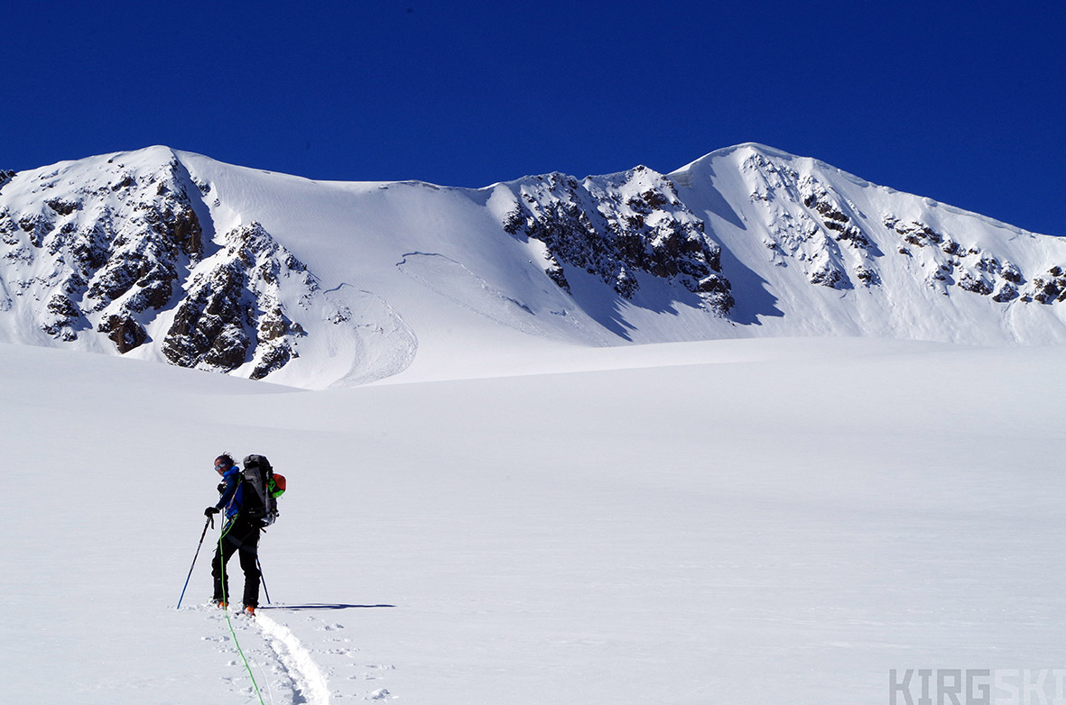 Sev tracks the glacier As we climb up we see multiple rests of spontaneous avalanches which do not quieten our fears.